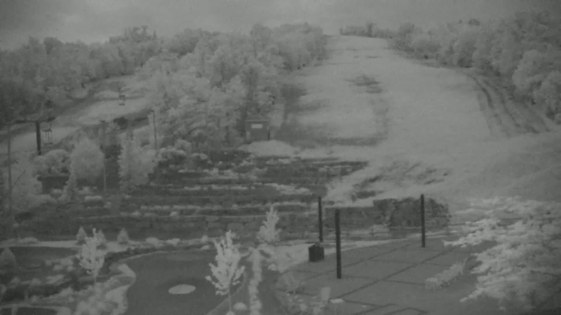 A hazy and cold night scene depicts a snow-making machine actively spraying snow over a snow-covered terrain featuring numerous mounds, bare trees, and an illuminated ramp-like structure in the foreground.