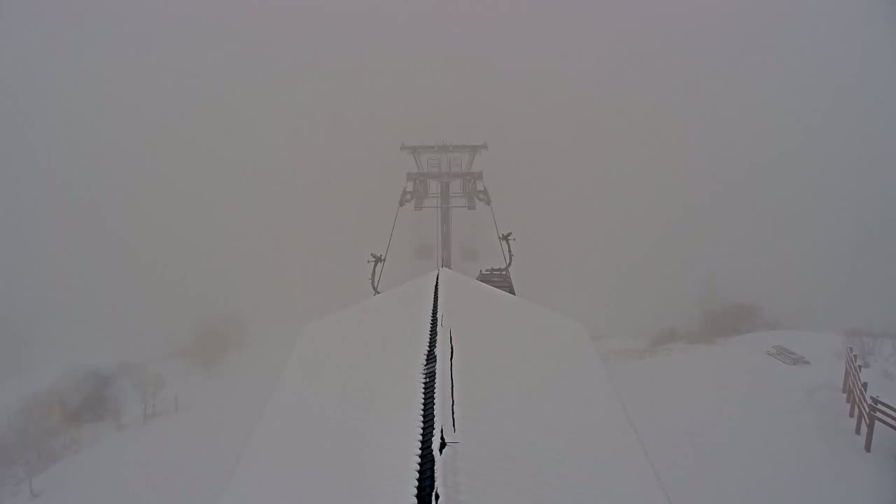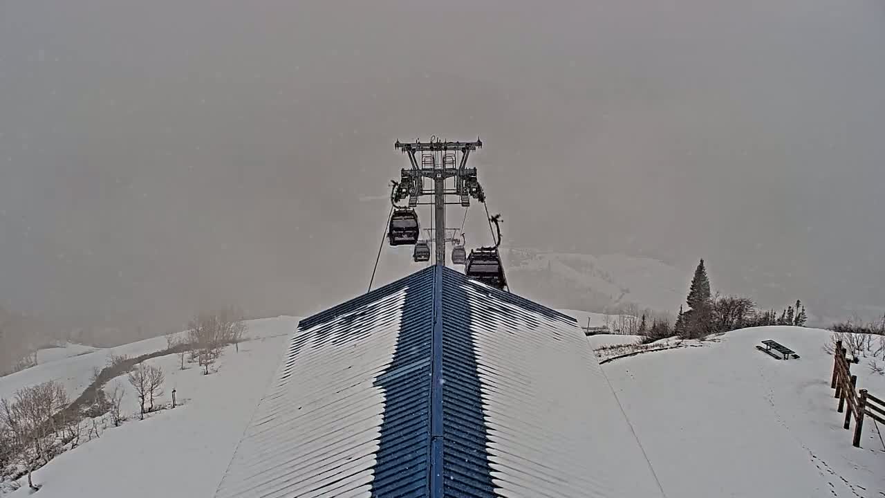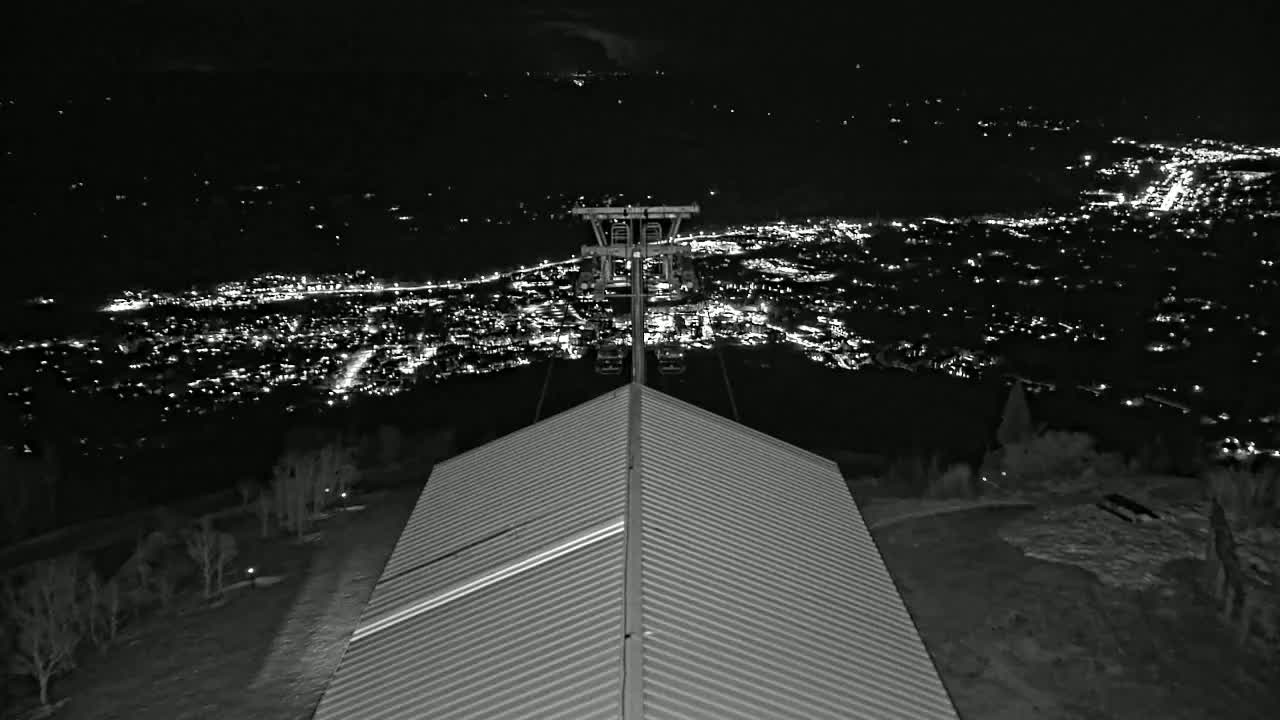 A night view from a snow-covered ski lift station looks out over a brightly lit, distant snow-dusted city under an overcast sky, with light snow falling or recently fallen.