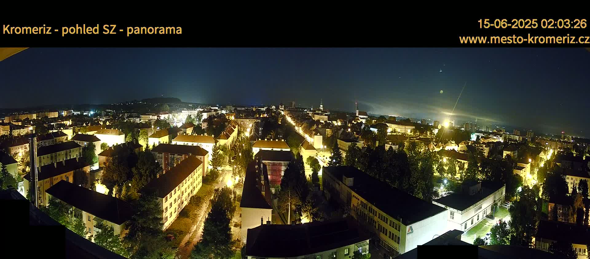 From the northwest view, Kroměříž reveals its scenic blend of historic buildings and lush greenery. The grand silhouette of the Archbishop’s Palace dominates the skyline, with the town’s spires and rooftops spreading out beneath it. Rolling hills and cultivated fields provide a serene and natural frame to this cultural landmark.