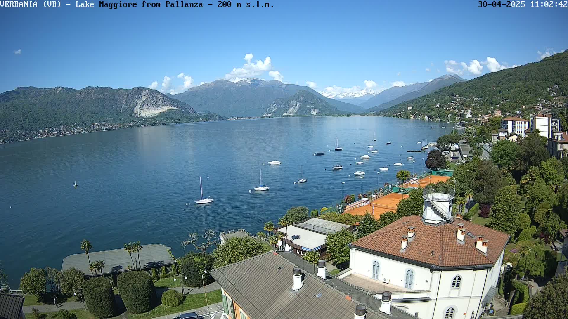 Live webcam from Verbania, Italy, offers a panoramic view of the Borromeo Gulf of Lake Maggiore, with the Alps in the background. Positioned on the lakeside Corso Tonolli, the webcam captures a breathtaking panorama from left to right, including the Monte Cerano and Monte Massone, and the solitary Montorfano in the center, followed by the Pizzo d'Andolla, Weissmies, and Pizzo Proman.