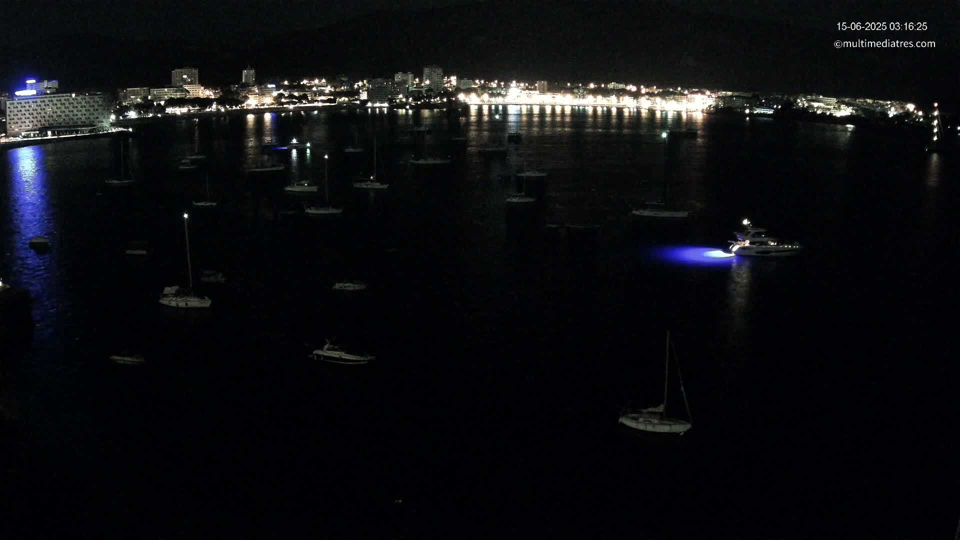 Numerous sailboats and a few motorboats dot a sunny, turquoise bay fronting a coastal town with a sandy beach and lush mountains, all under a blue sky dotted with fluffy white clouds.