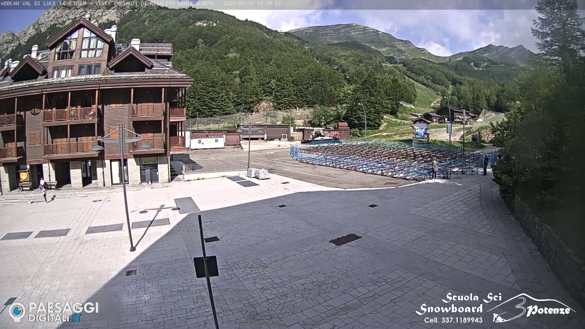Live webcam footage from the Val di Luce ski resort within the Abetone area. The webcam is pointed East, capturing ski lifts and the prominent Monte Gomito on the left. The webcam is hosted by the 3 Potenze Ski School.