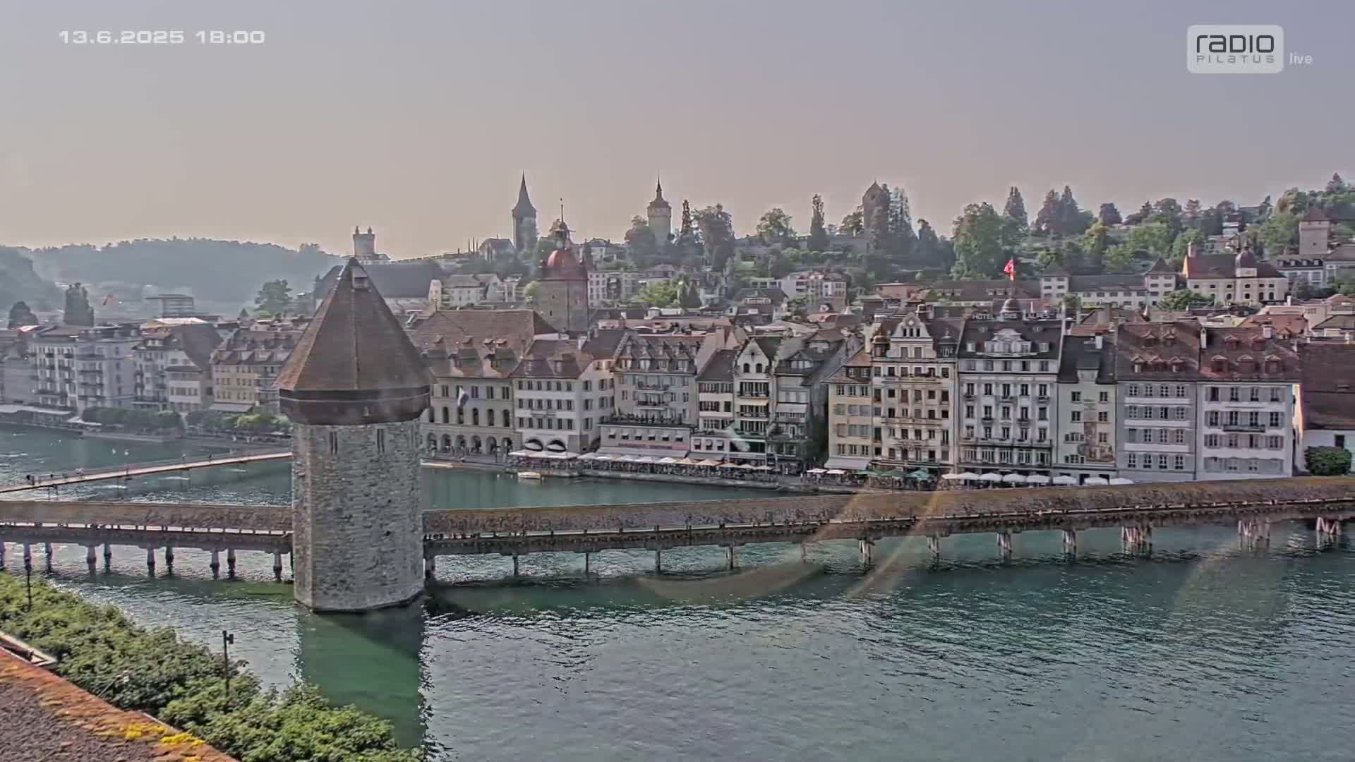 A historic European city is viewed on an overcast day, featuring a prominent covered wooden bridge and stone tower spanning a calm river, with numerous multi-story buildings and spired churches rising along the waterfront and up a distant hillside.
