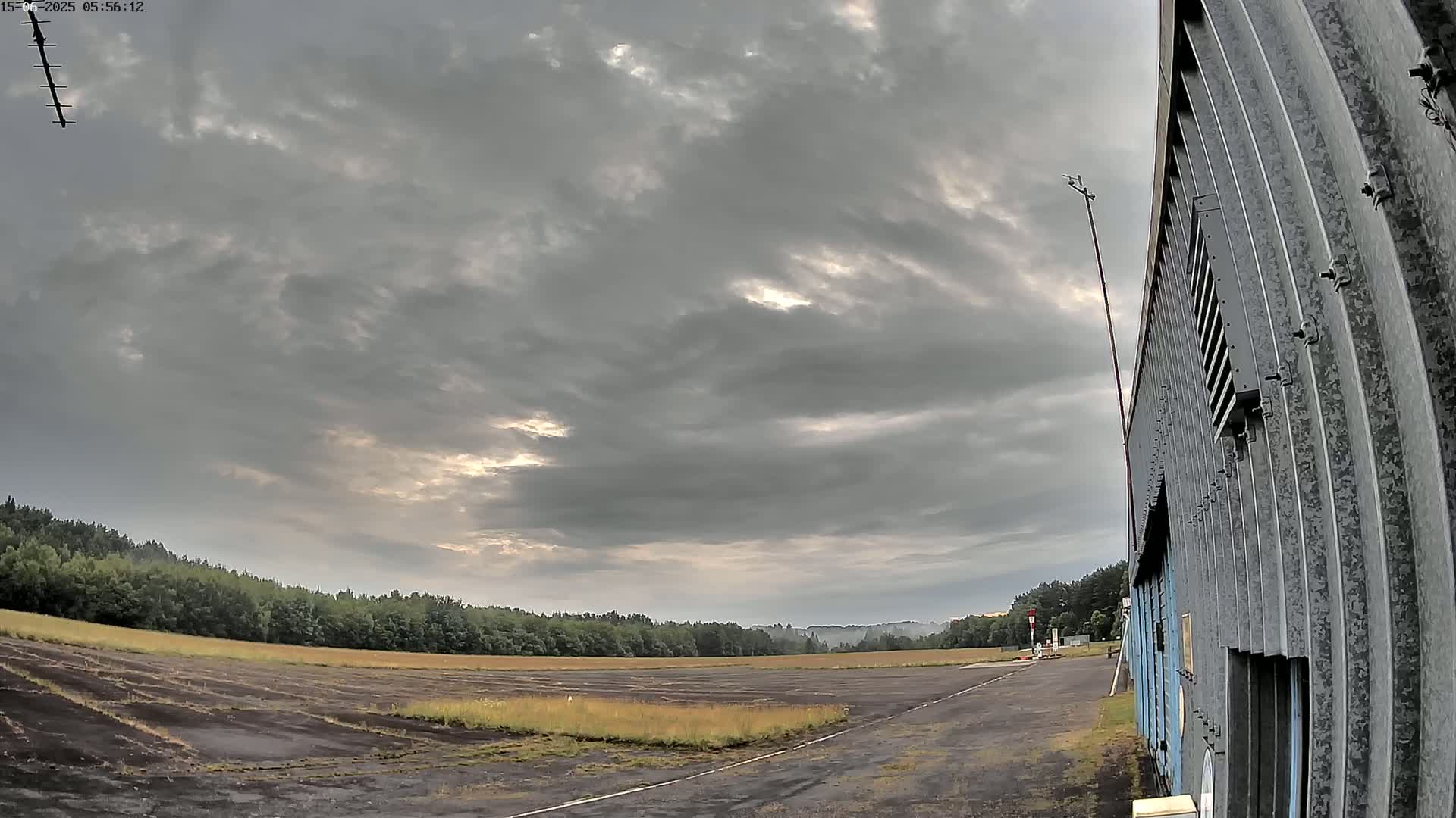 A wide-angle outdoor view captures a wet airfield tarmac bordered by bare winter trees and a corrugated metal building under a heavily overcast and gloomy sky with dark grey clouds.