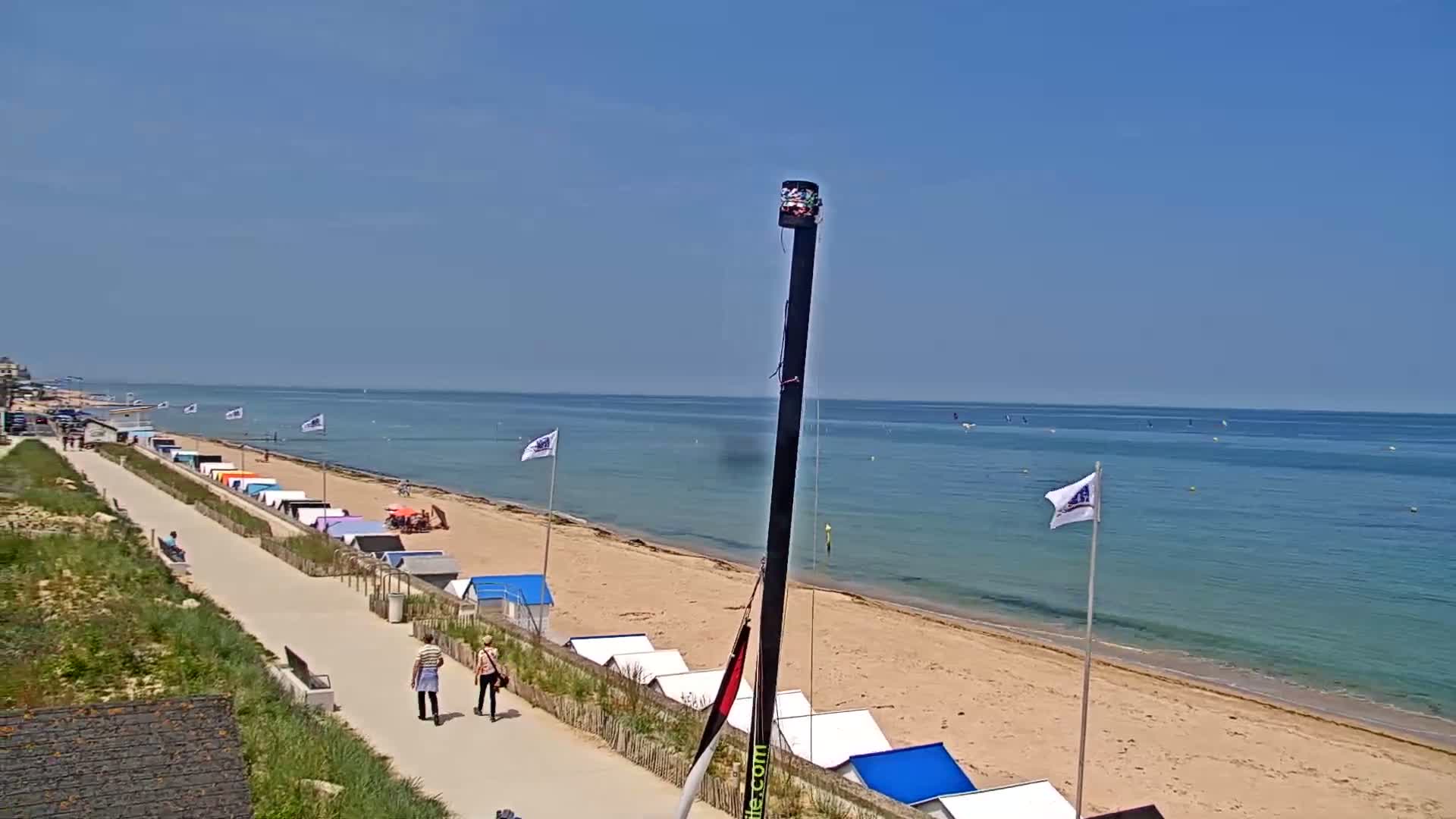 On an overcast day with patches of blue sky, a windsurfer and a kitesurfer navigate the choppy sea off a sandy beach, with a dark pier extending into the water on the right.