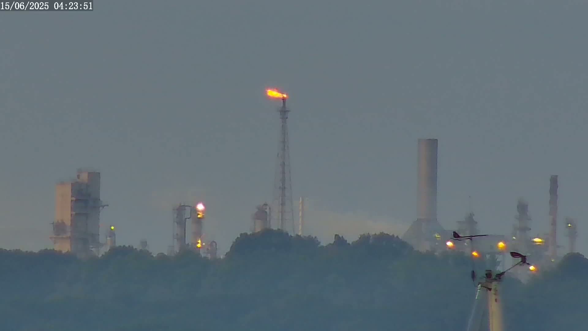 A clear dawn or dusk sky hangs over an industrial scene featuring the top of a blue boat, a flare stack with a bright flame, extensive scaffolding, and numerous factory chimneys emitting plumes of steam.