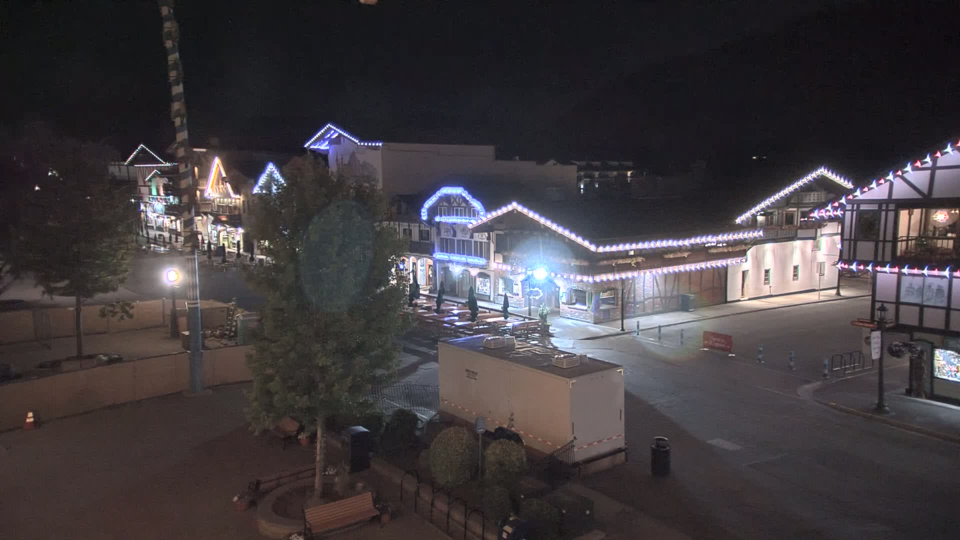A festive street adorned with Bavarian-style buildings and numerous trees is brightly illuminated with colorful holiday lights under a clear night sky.