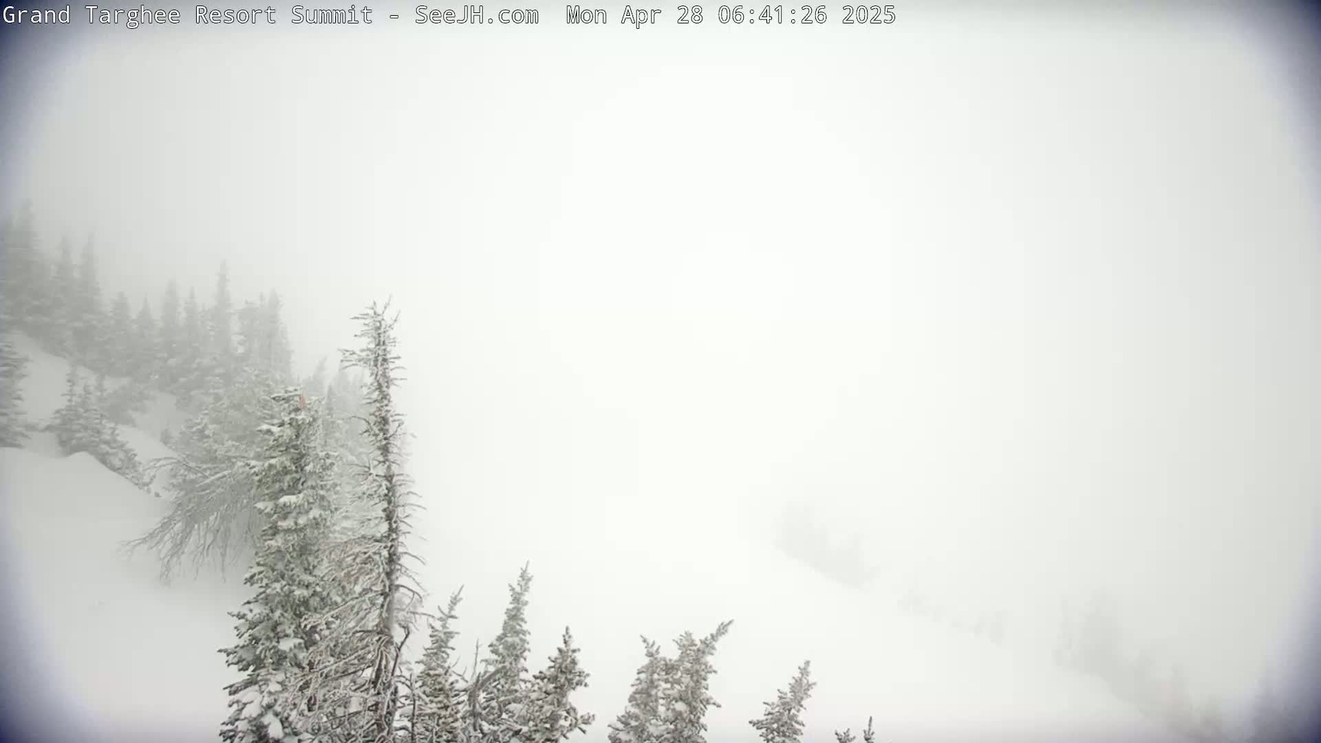 A nighttime view of a snow-covered mountain resort reveals a brightly lit building and snow-laden trees under heavy snowfall or blizzard conditions.