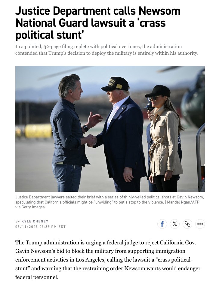 The Justice Department labels Gov. Newsom's National Guard lawsuit a 'crass political stunt,' escalating tensions between California and the federal government.