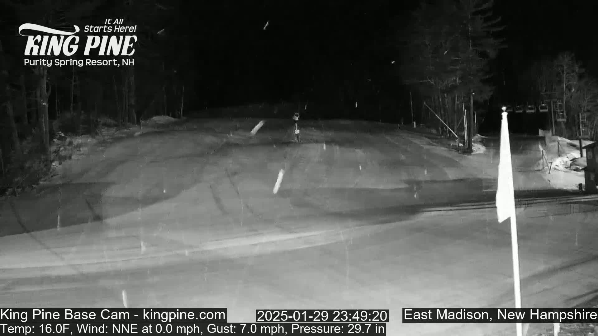 A mostly barren ski slope with a chairlift and an American flag is visible, under a cloudy sky with a slight northeast wind.