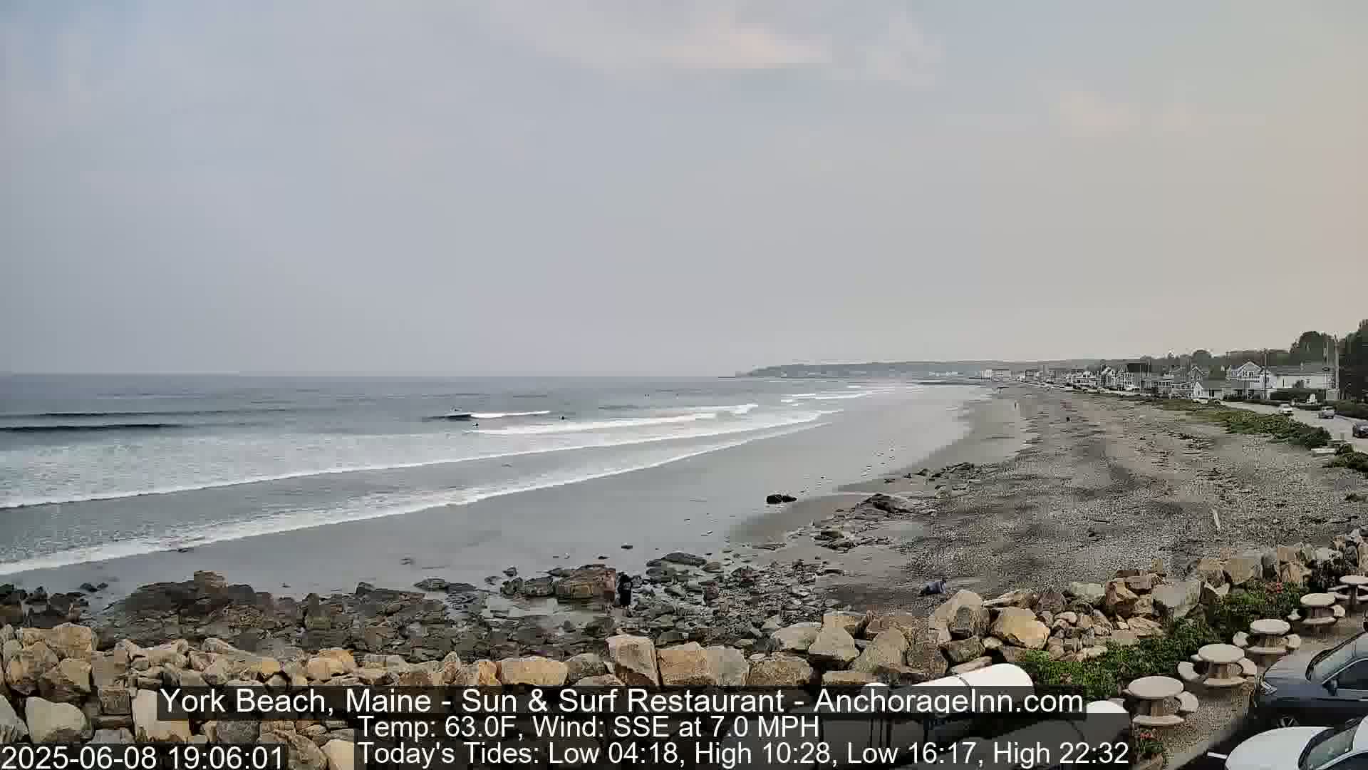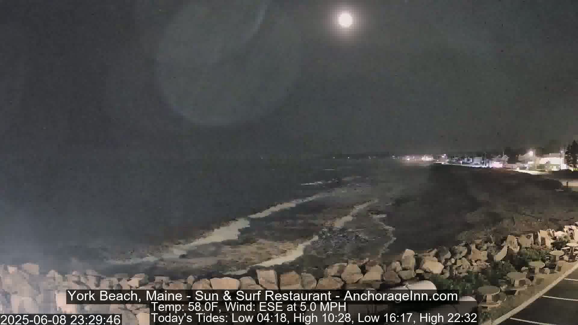 A nighttime view reveals a dark beach with gentle waves under an overcast sky, with scattered lights from coastal buildings illuminating the horizon and rocks in the foreground.