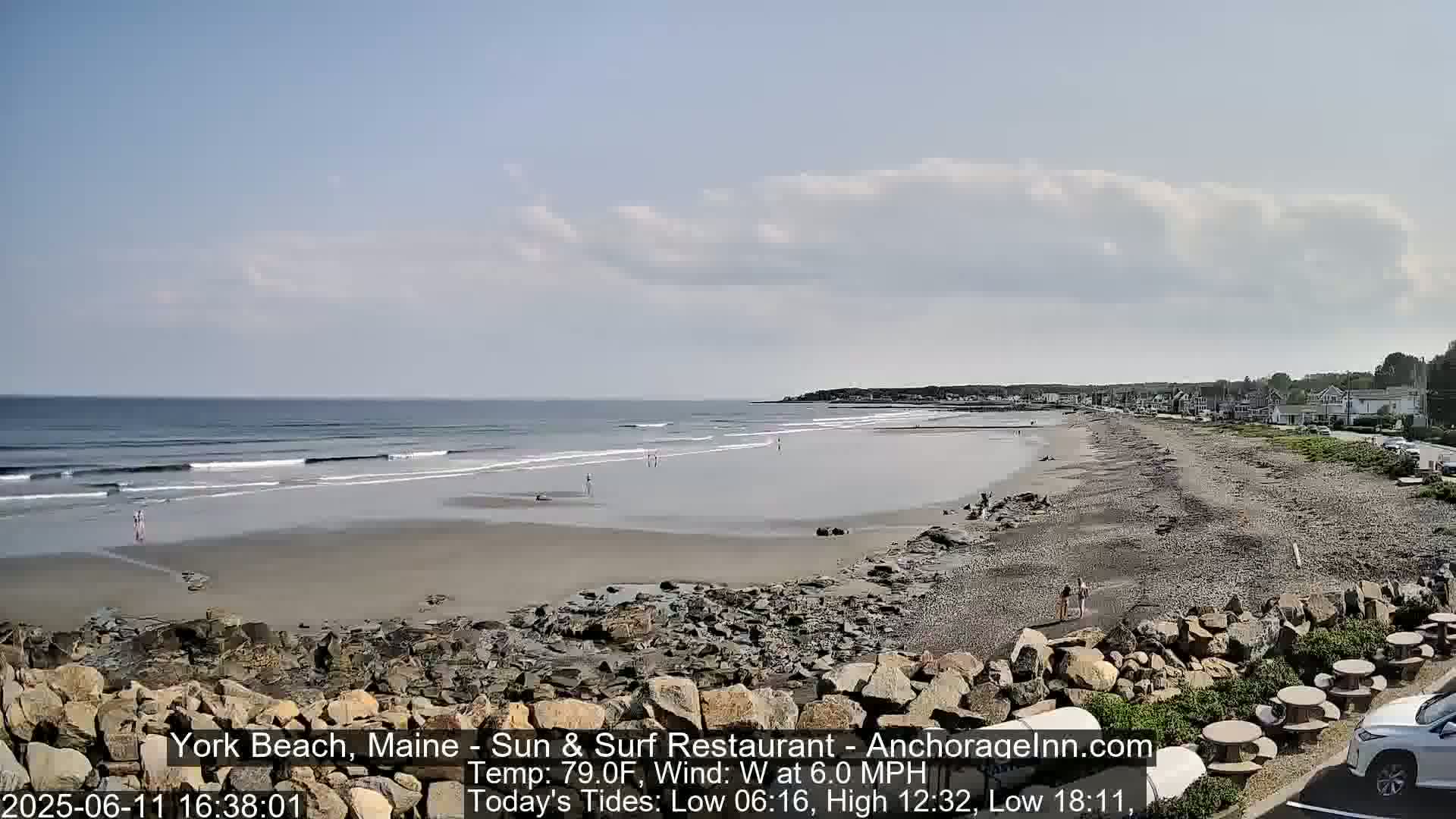 A snow-covered beach stretches under an overcast sky with light snowfall, featuring gentle waves breaking on the shore, a rocky foreground, and distant coastal buildings lining a snowy road.