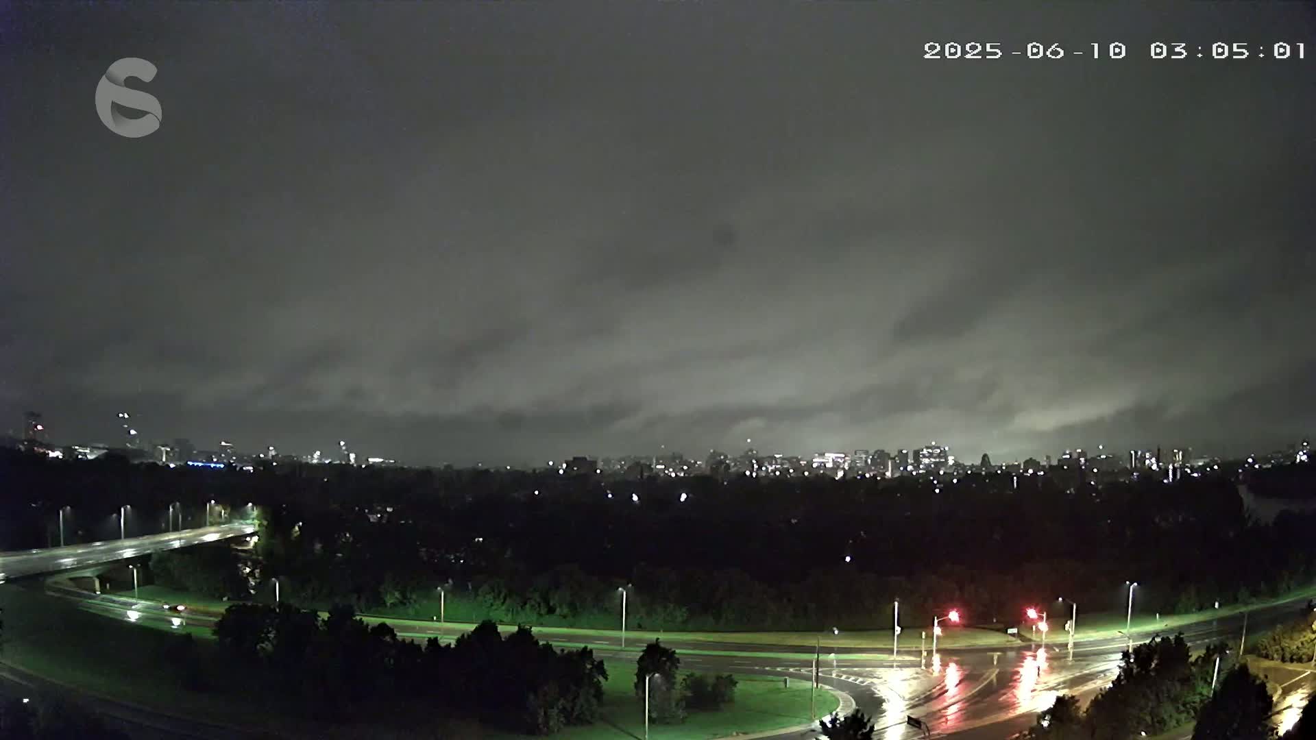 An elevated view reveals an urban landscape under a heavily overcast and grey sky, with a distant city skyline, a wide river bordered by bare trees, and multiple roads with moving traffic in the foreground.
