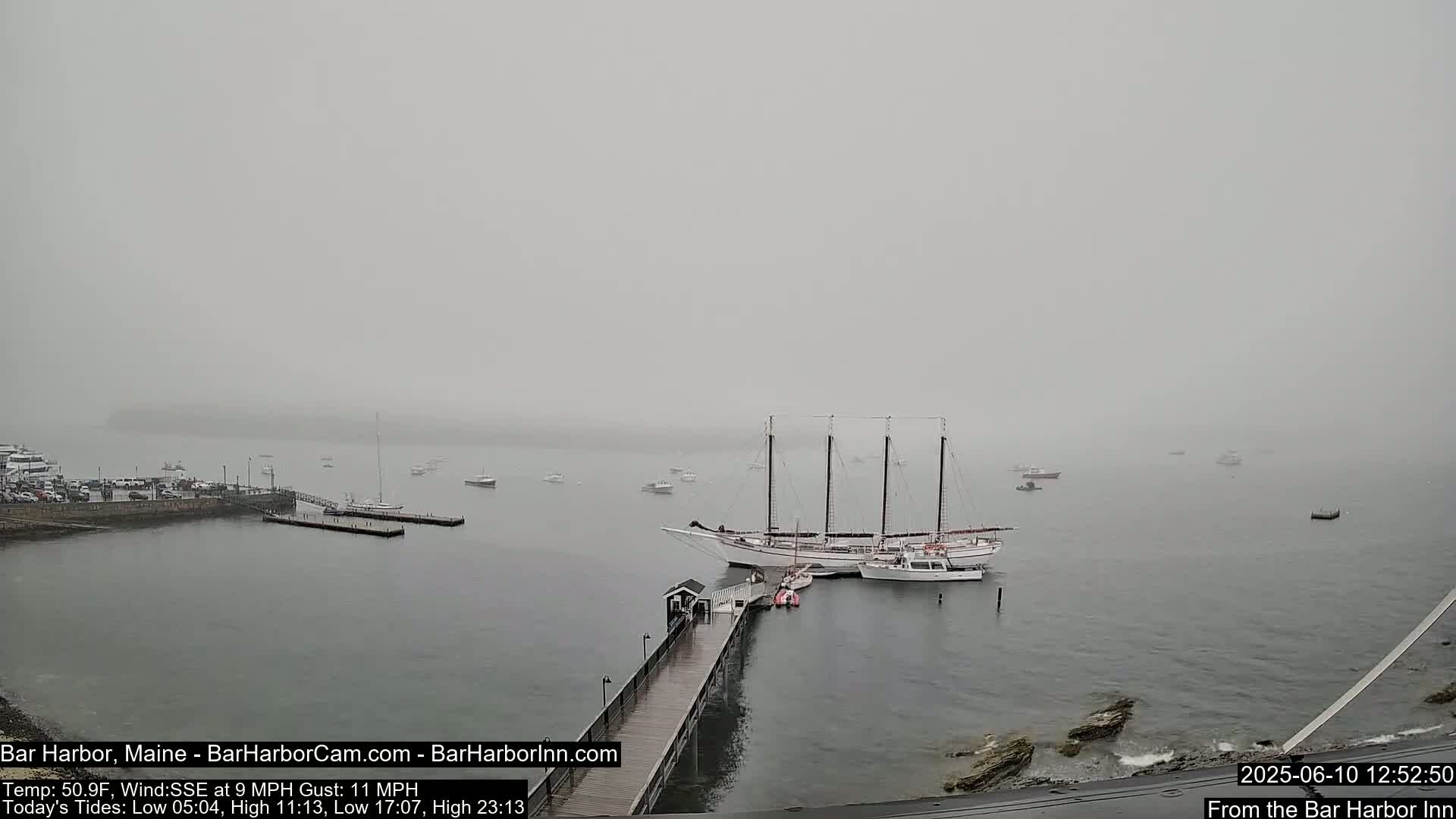 On a grey, overcast winter day, a snowy shoreline and pier lead into a calm bay with several boats, backed by snow-dusted, forested islands.