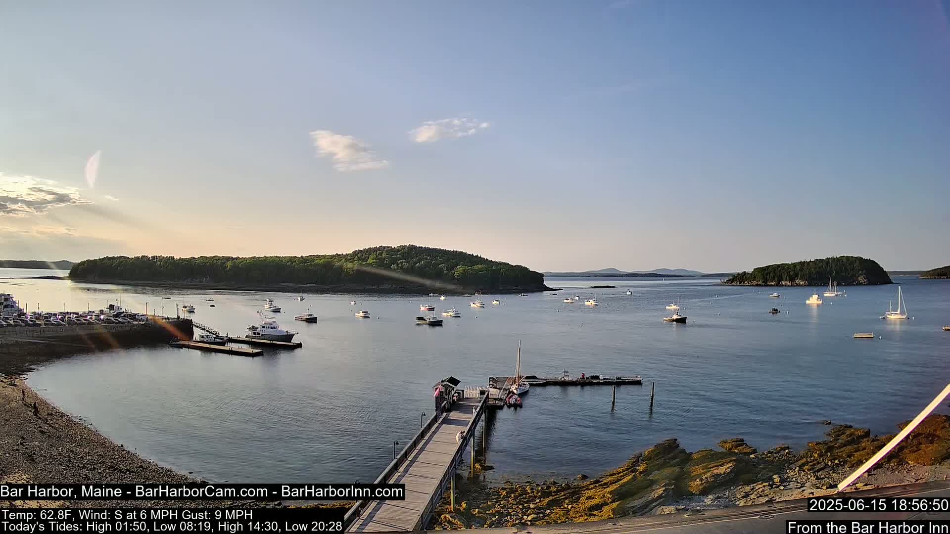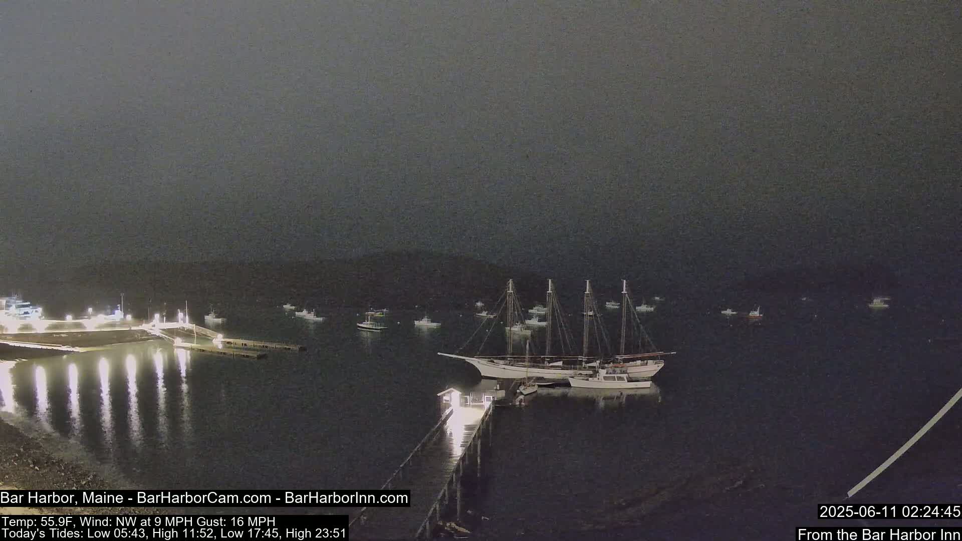 An overcast night scene of a harbor features illuminated docks and a pier reflecting on calm water, with dark, tree-lined islands in the background and boats scattered across the bay.