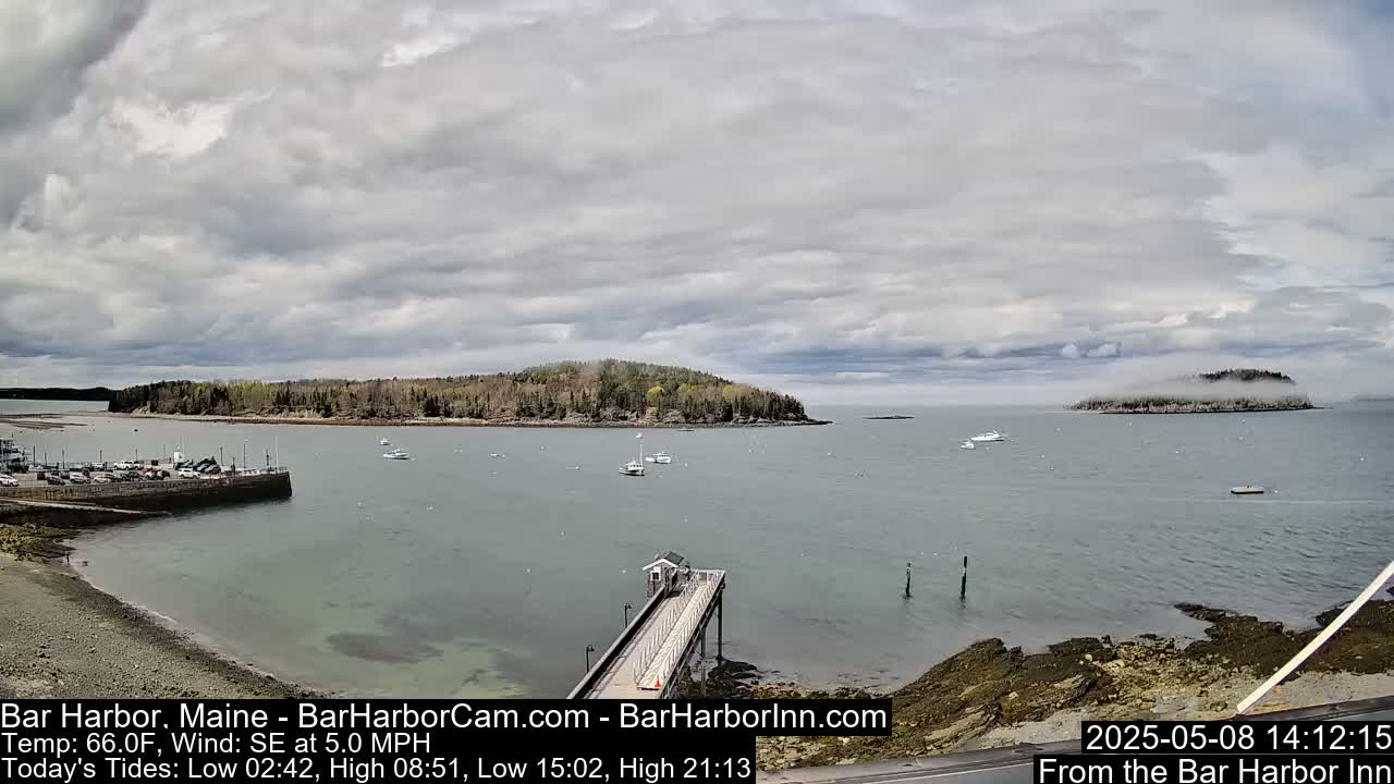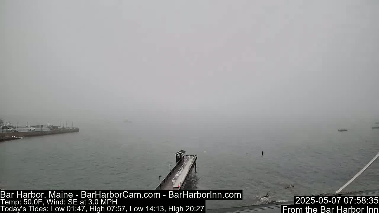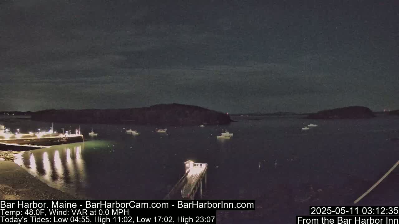 A large sailing ship and several smaller boats are moored in a calm harbor at night, under a dark, foggy sky.