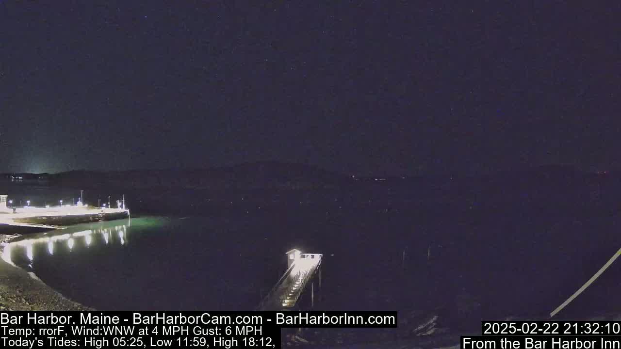A harbor scene on a sunny day shows a large sailing ship docked at a pier, surrounded by smaller boats and a wooded island in the background.