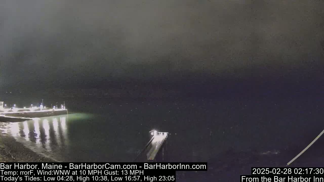 A calm harbor with numerous boats, a long wooden pier, and tree-covered islands in the distance under an overcast sky.