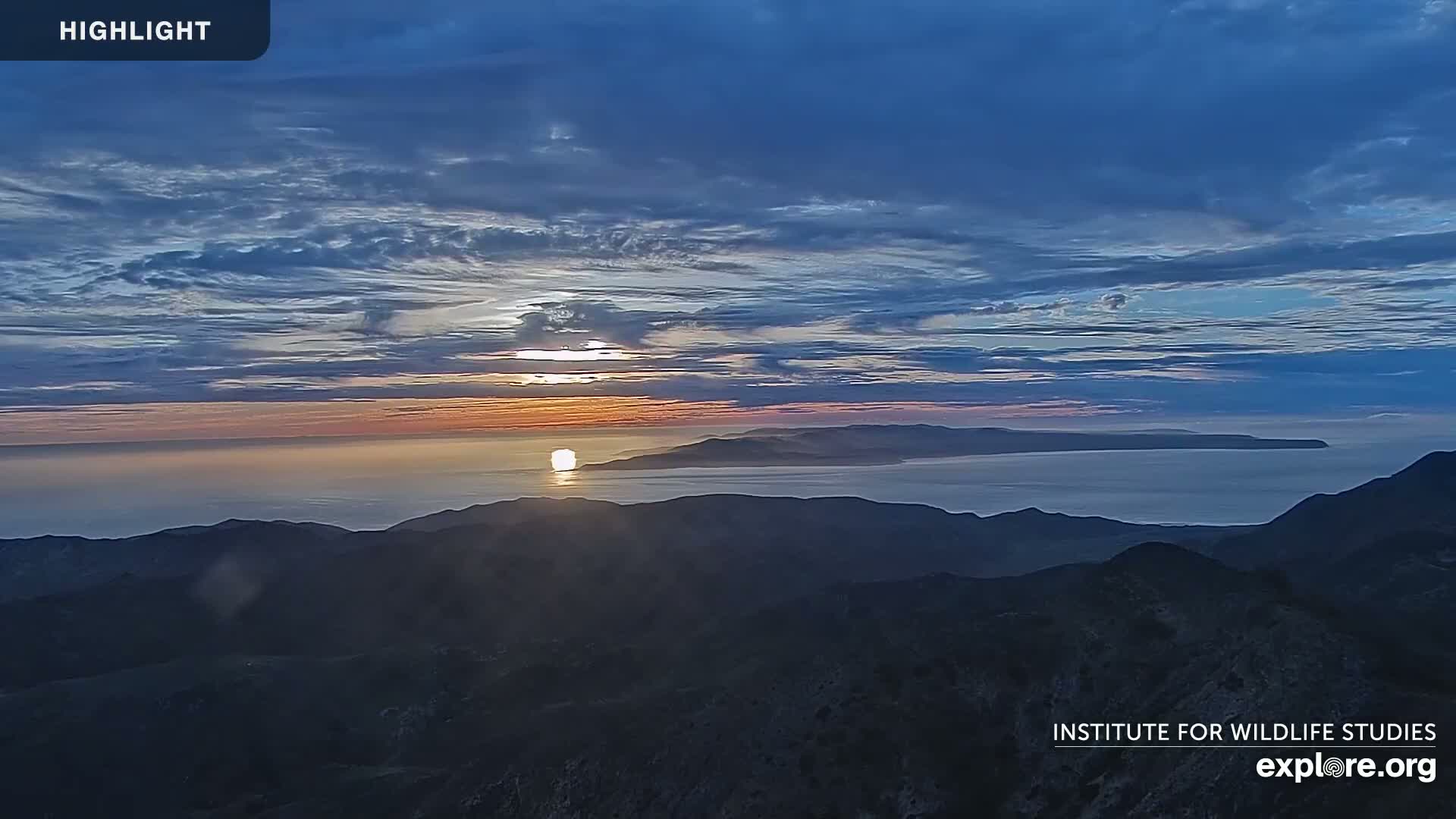 A sunrise over a calm ocean, illuminating a distant island and mountain range below a partly cloudy sky.