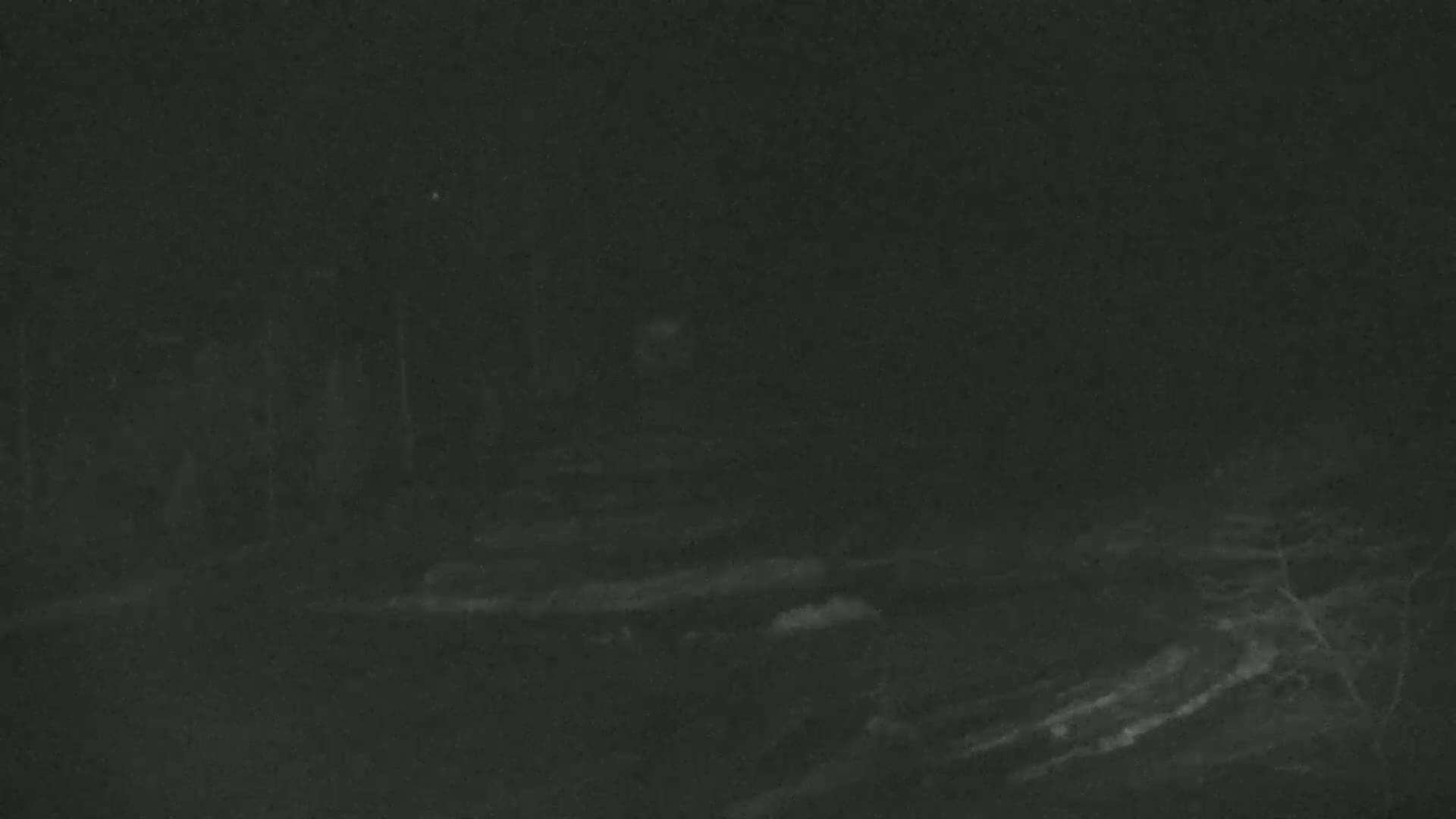 A snow-covered ski resort is seen at night under hazy conditions with light snow falling, featuring a prominent ski lift, numerous snow-dusted trees, and tiered rock formations.