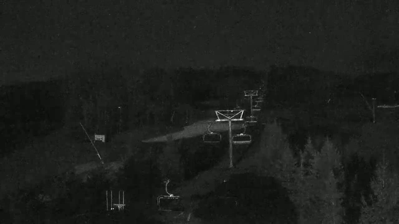 A grayscale image displays a snow-covered ski slope with a chairlift ascending uphill between scattered evergreen trees, under a heavily overcast sky with low visibility, suggesting foggy or actively snowing conditions.