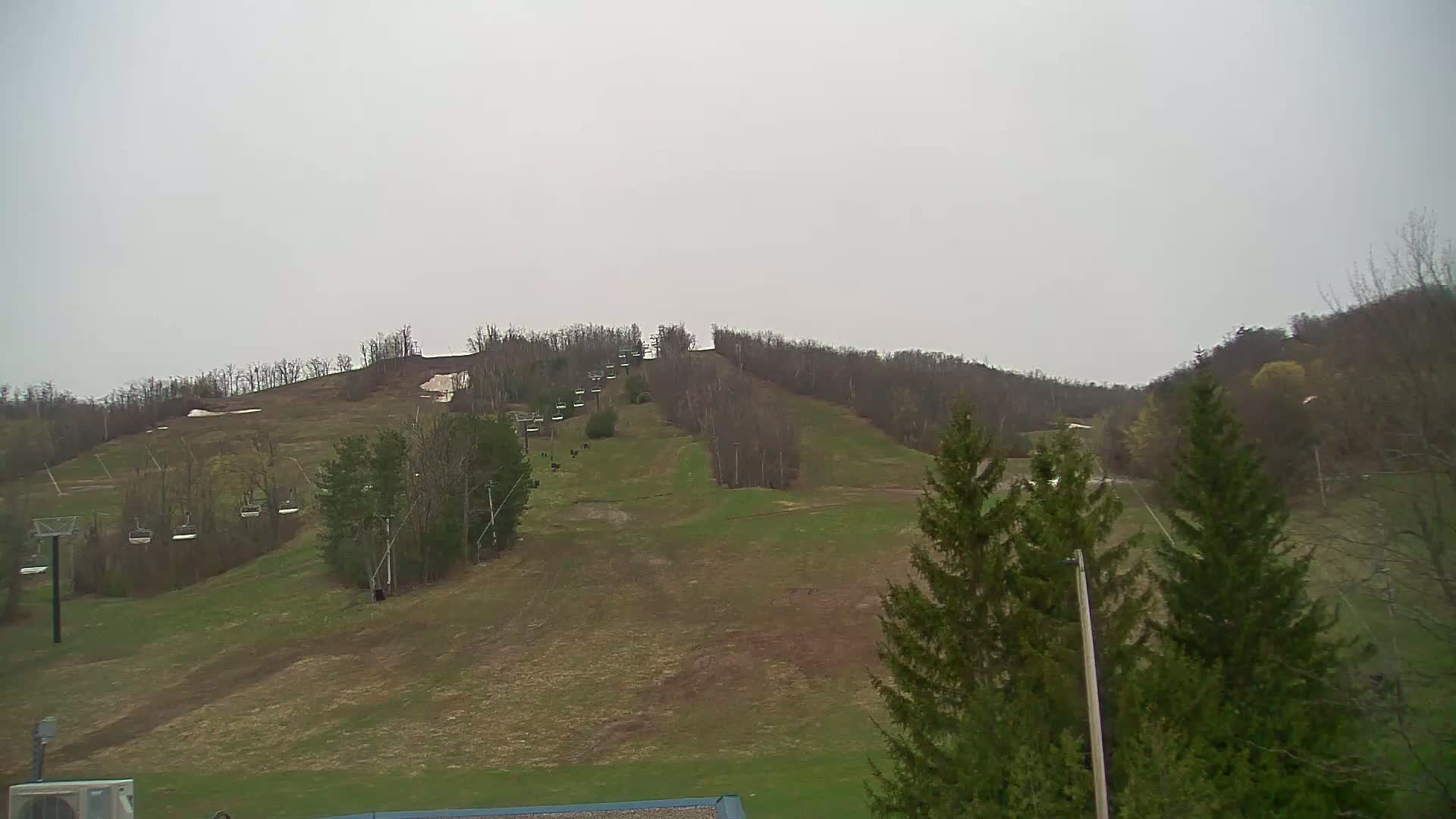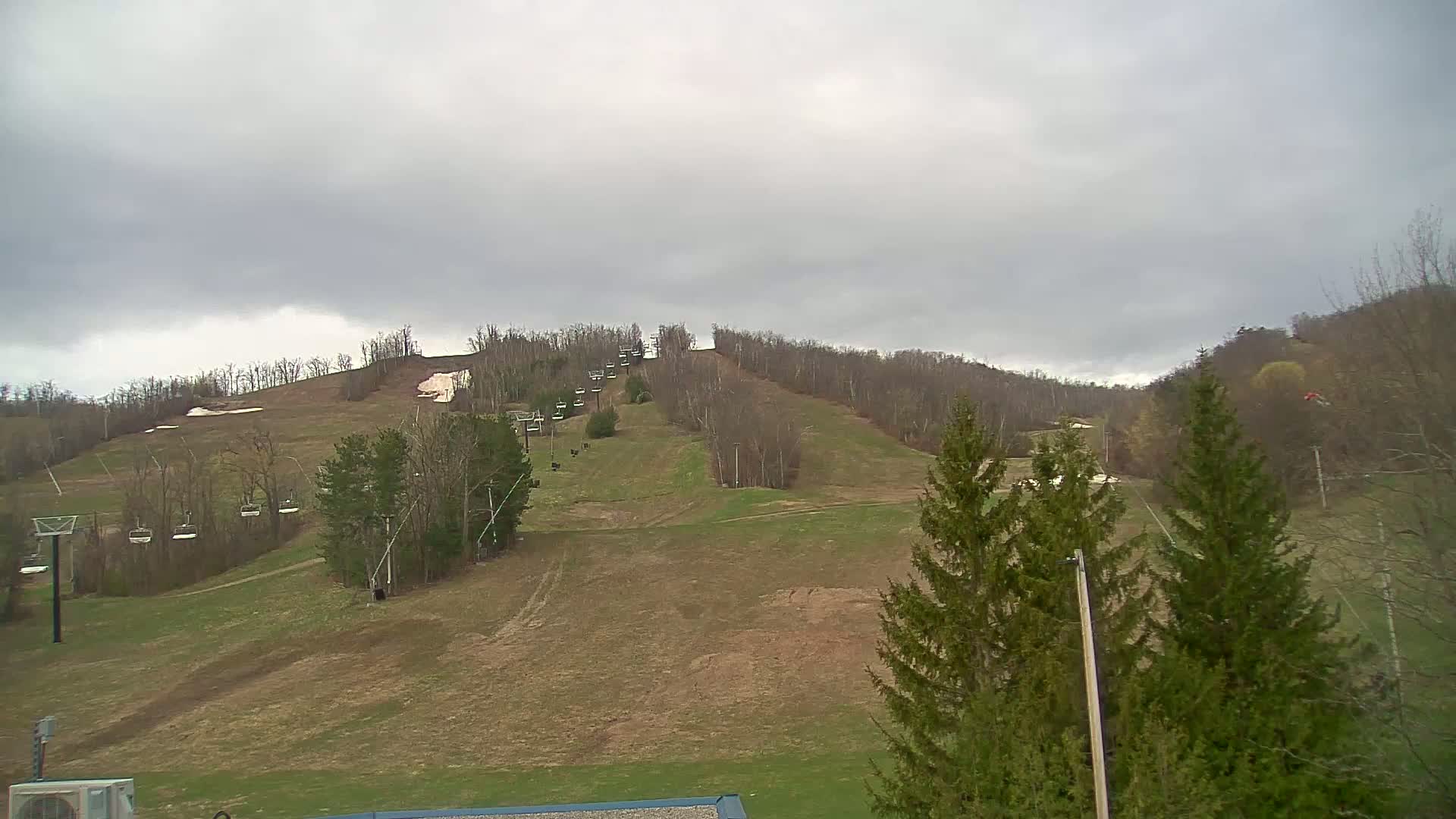 A snow-covered ski slope with scattered trees and visible ski lift poles is pictured under a heavily overcast, cloudy sky with a faint pink hue visible towards the upper left.