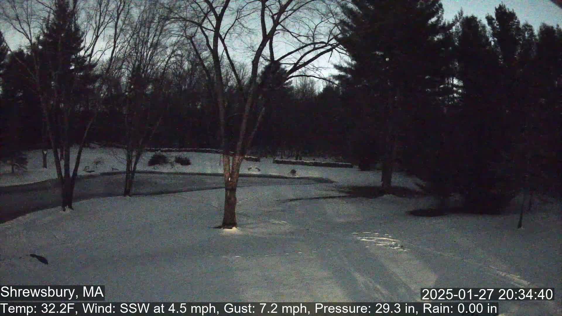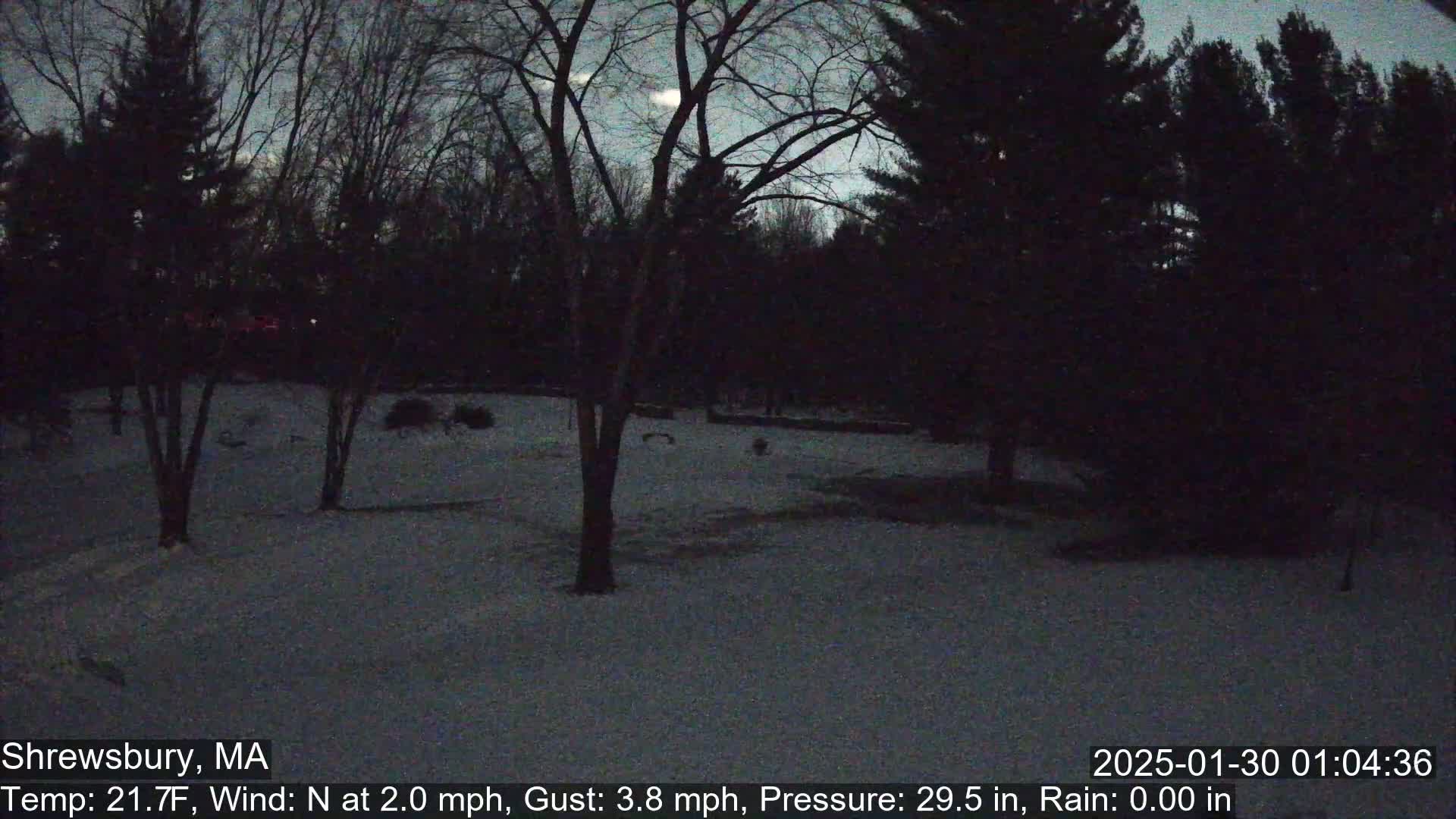 A dark, nighttime view of a wooded area under a twilight sky with a light north wind.