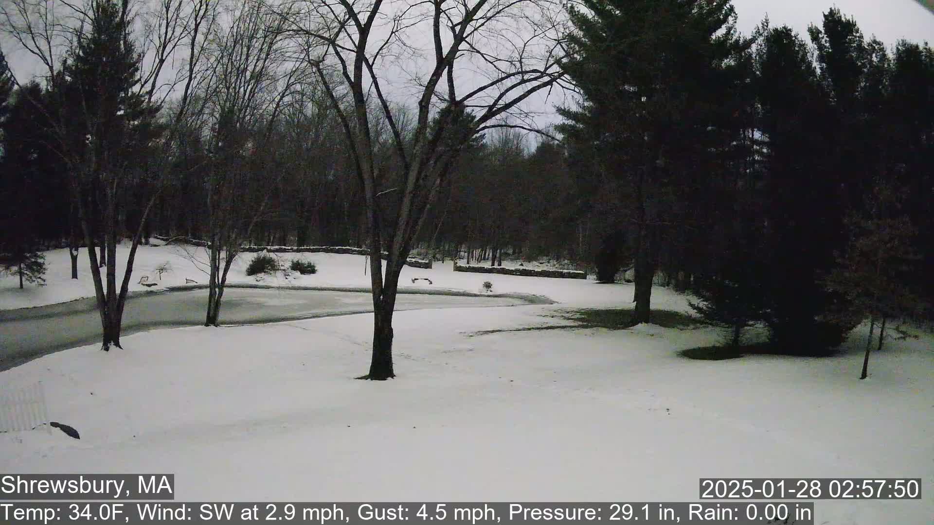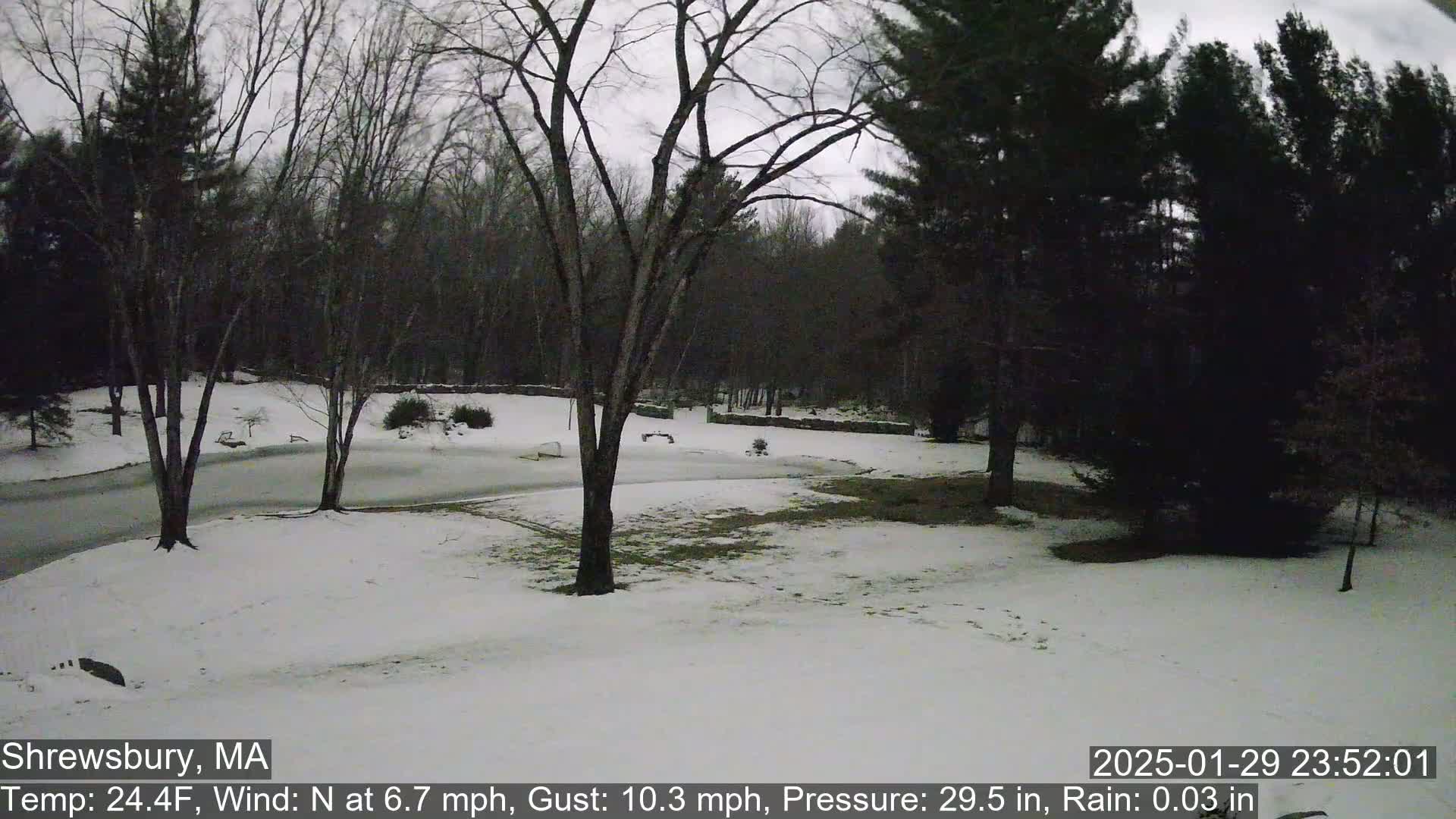 A grassy lawn with a pond and stone wall is visible, surrounded by bare and evergreen trees under an overcast sky with light rain.