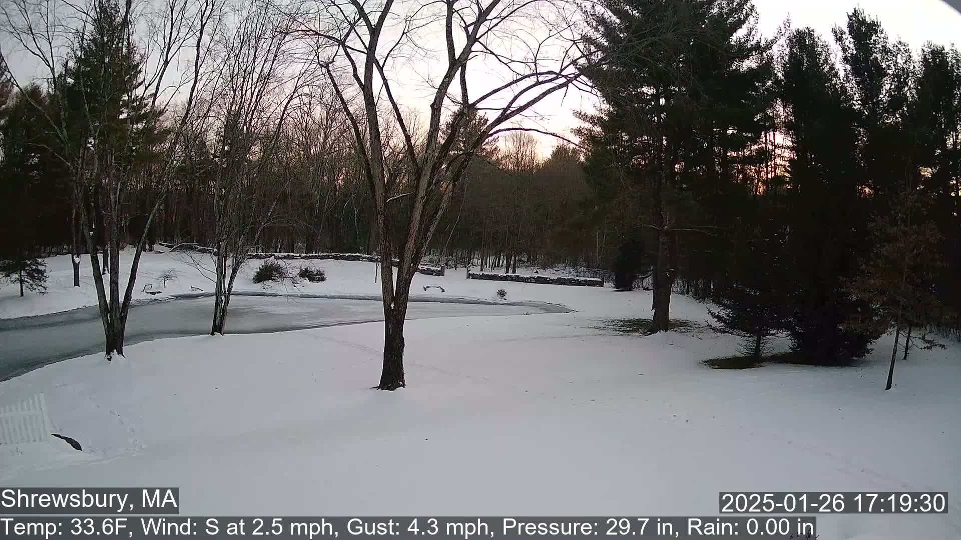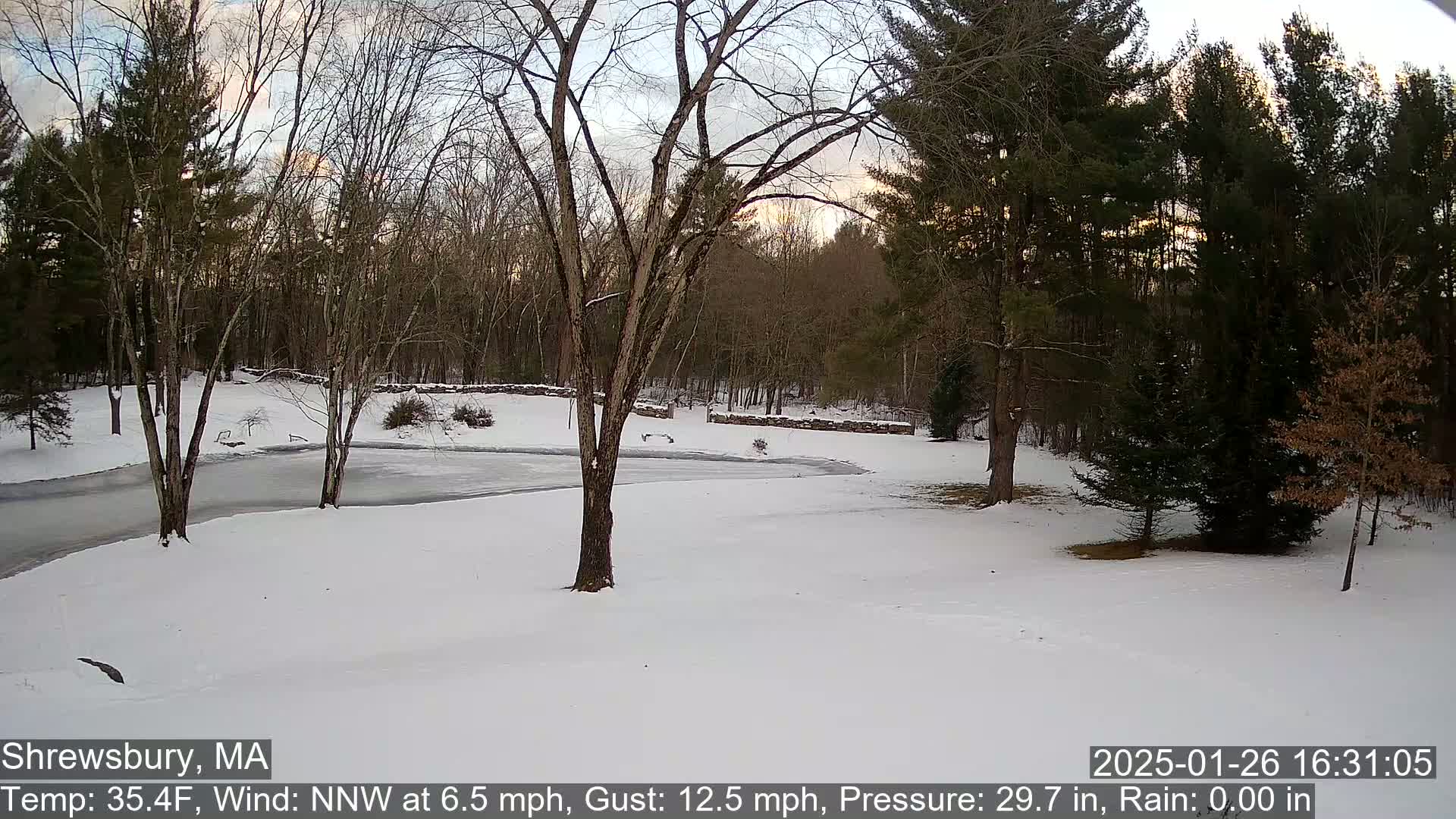 A snow-covered lawn and trees are visible in the overcast outdoor scene.