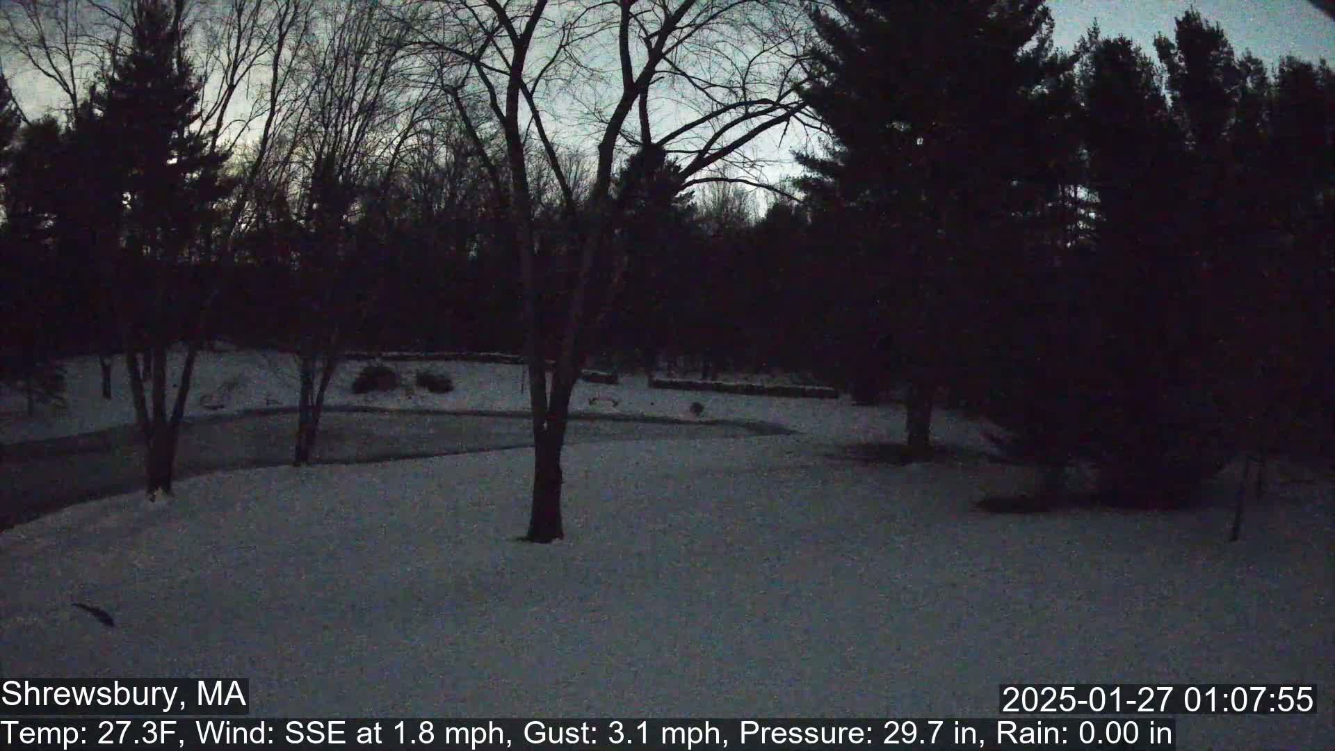 A dark, nighttime scene shows a grassy yard, a small body of water, and trees under a mostly cloudy sky with a slight north wind.