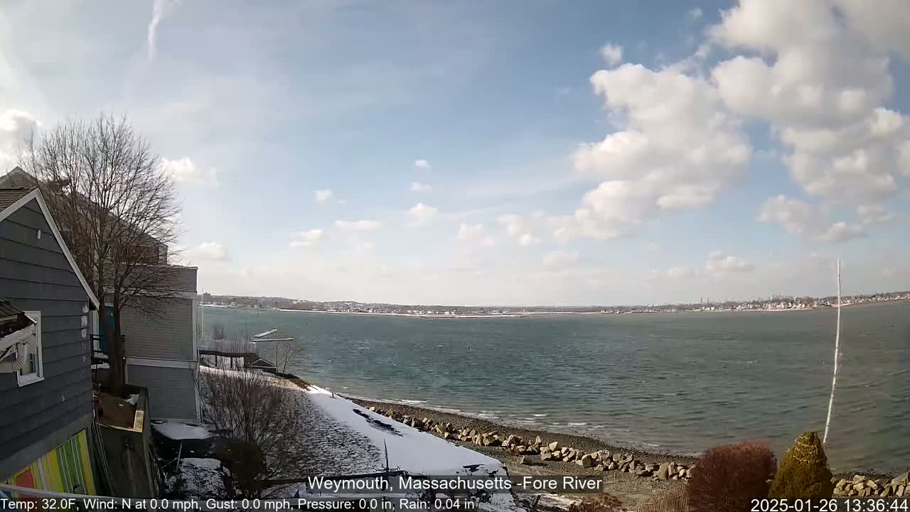 A partially cloudy, cool day shows an American flag waving on a pole near a calm body of water with a shoreline and houses visible in the background.