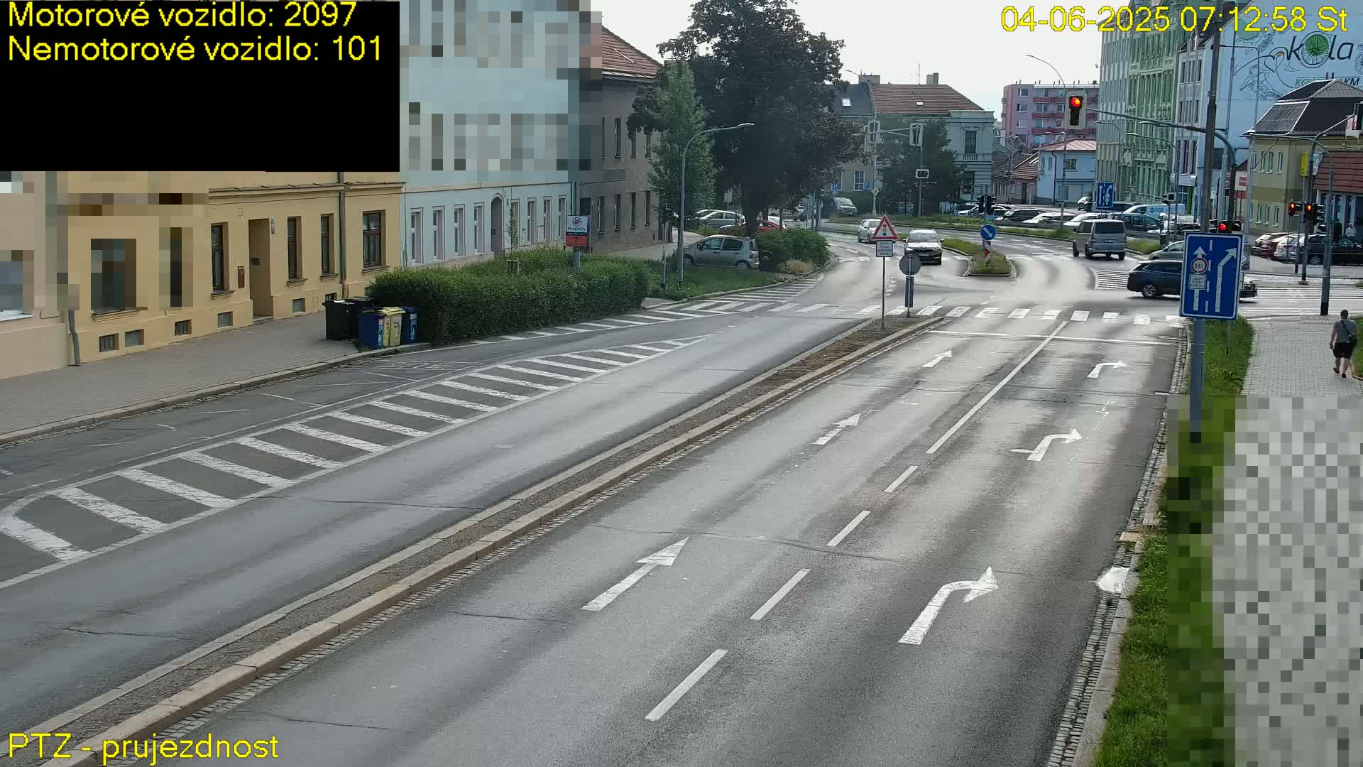 A street scene in a European town depicts an intersection with cars driving, a pedestrian crossing, and buildings under an overcast sky.