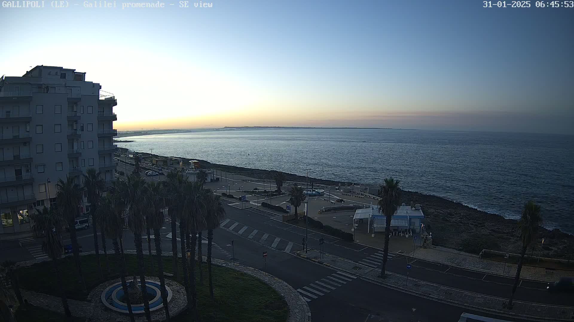 A coastal town at dusk, showing a calm sea under a mostly clear twilight sky, with palm trees lining a road near a multi-story building.