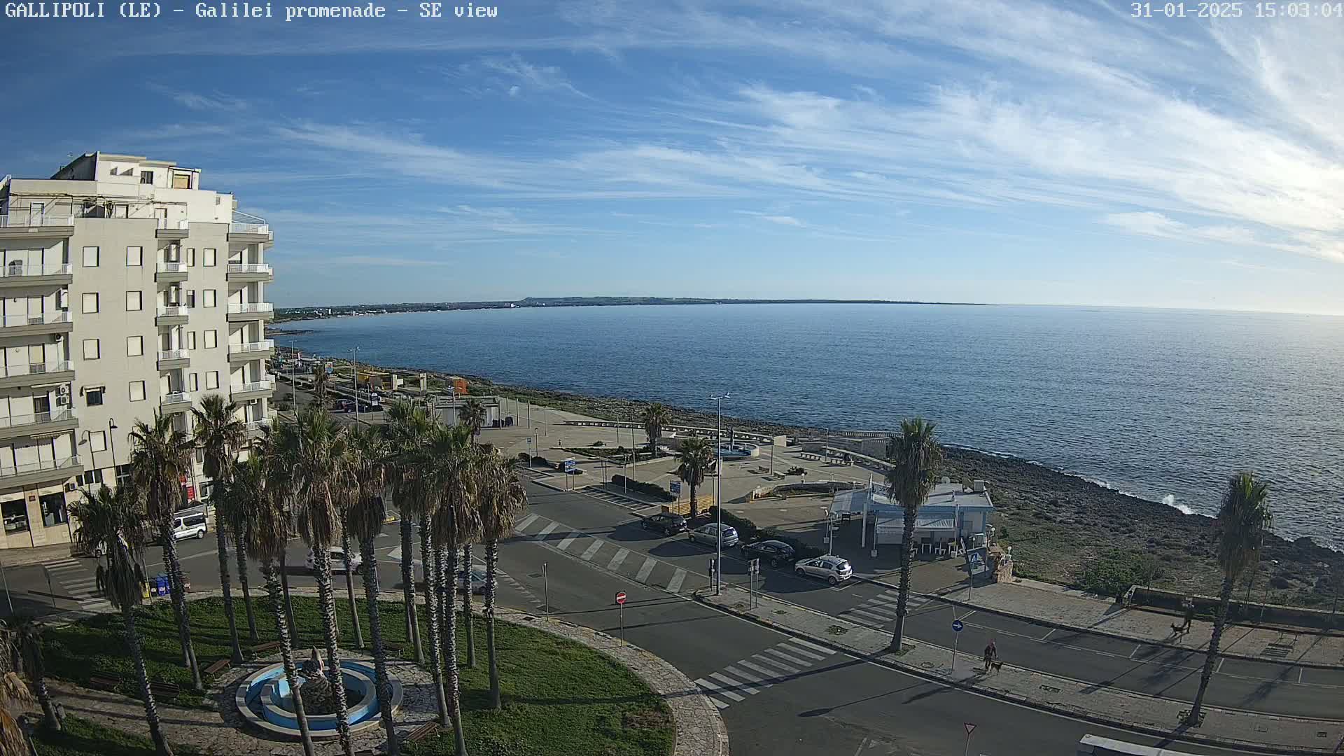 A partly cloudy day reveals a seaside promenade with palm trees, a few cars, and buildings overlooking a calm sea.