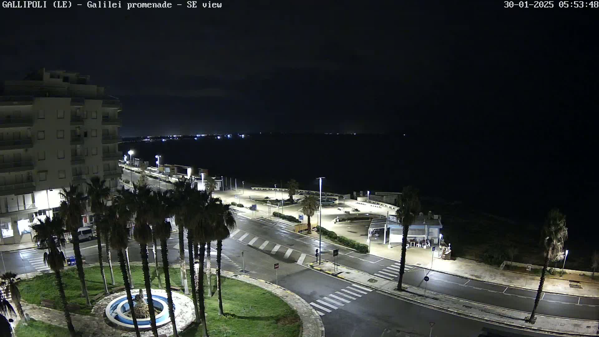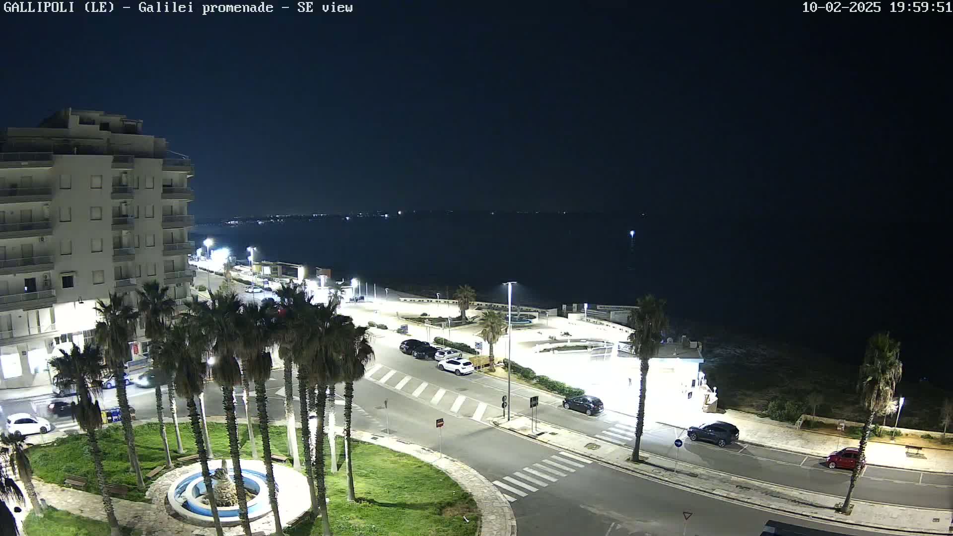 A nighttime view of a coastal town's promenade shows a calm, dark sea, palm trees lining a mostly empty road, and a building in the background under a clear, dark sky.
