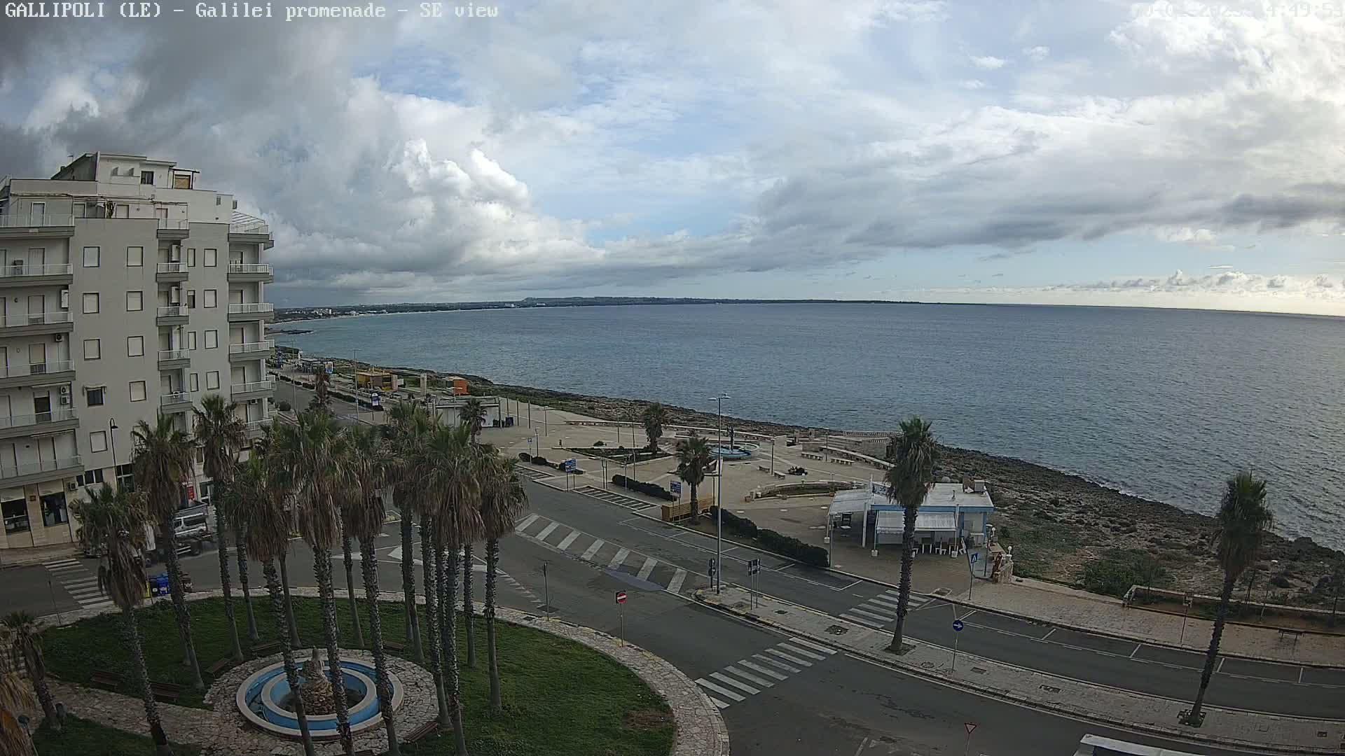 A mostly sunny day reveals a seaside promenade with palm trees, buildings, and a calm ocean extending to a distant shoreline.