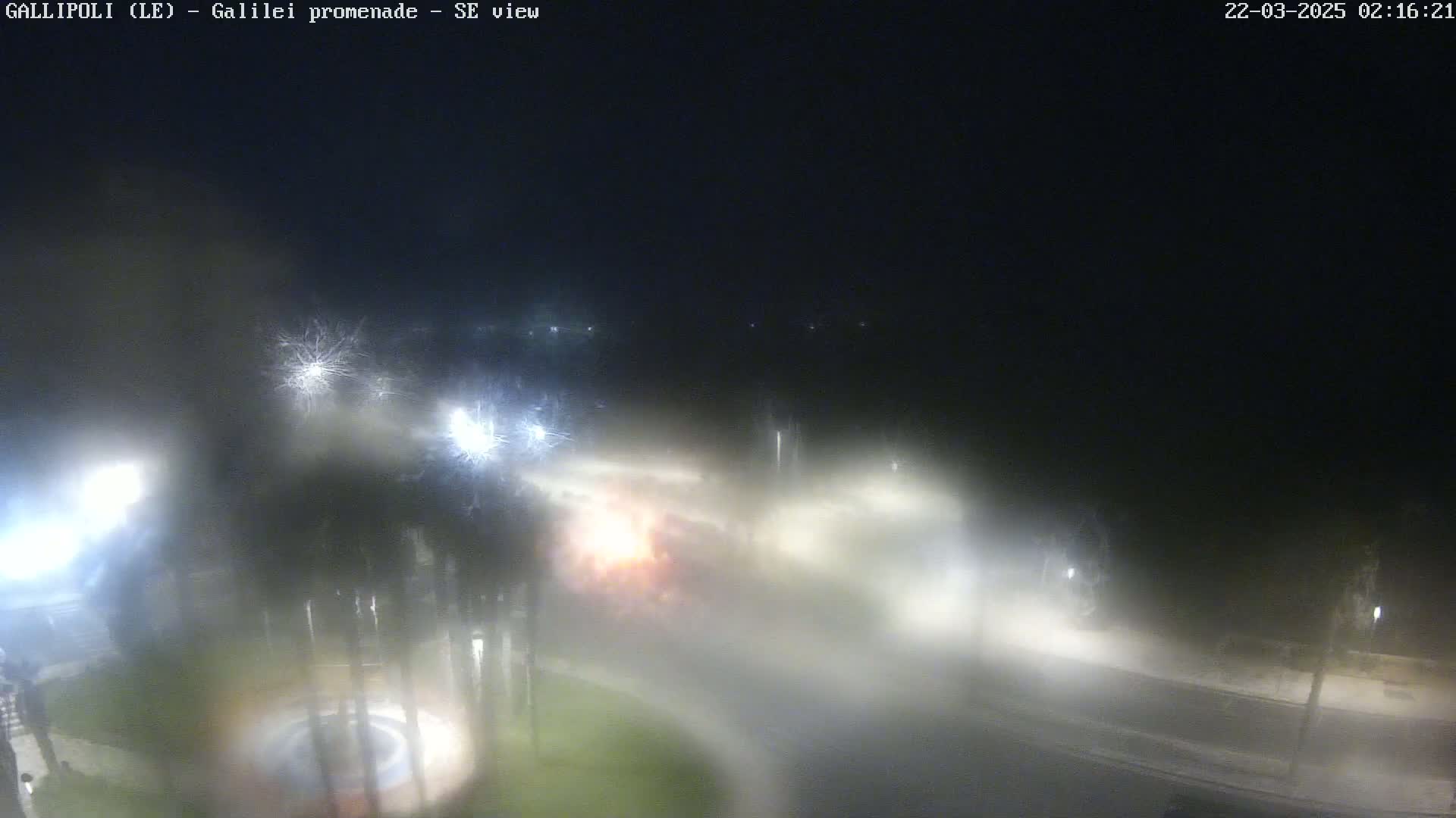 A seaside town on a sunny day shows a calm blue sea, a palm tree-lined promenade, a multi-story building, and several cars parked and driving along the street.