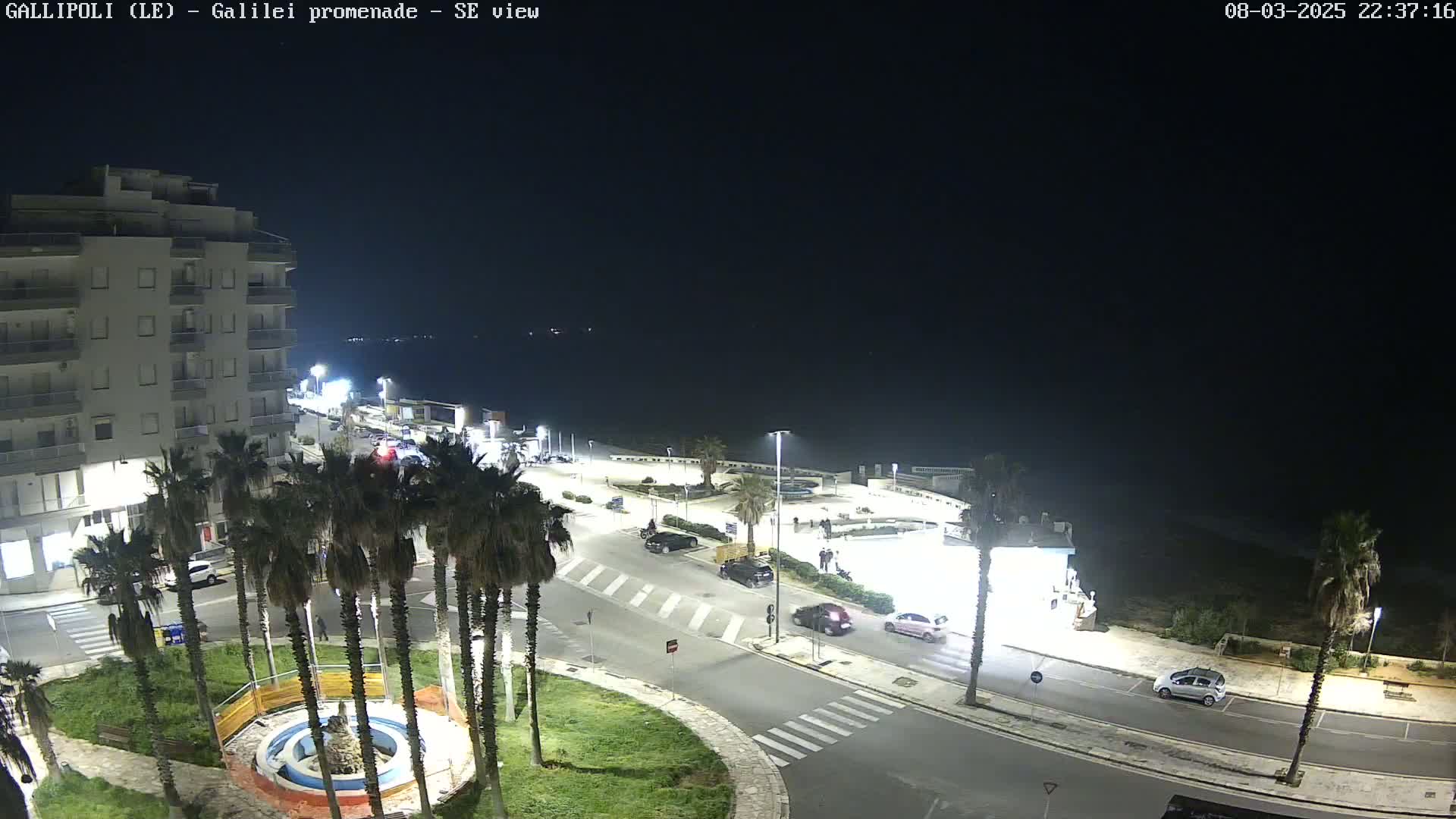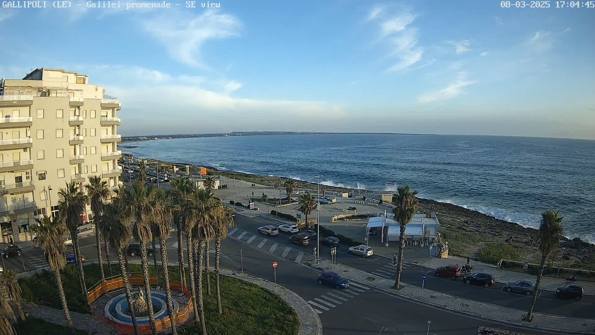 A partly cloudy sunny day shows a coastal town scene with a multi-story building, palm trees, a road, and a beachfront area with a few small buildings and calm blue water.