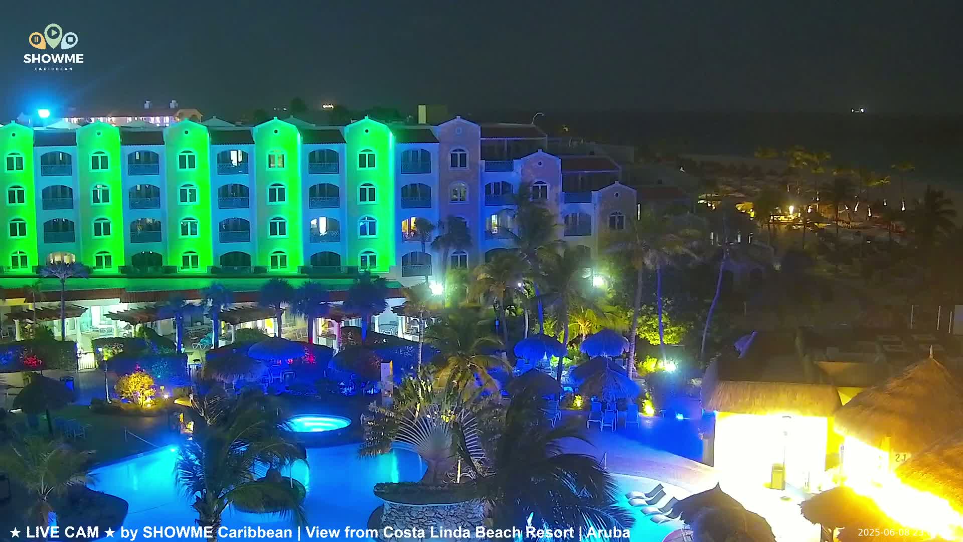 A brightly lit resort at night, featuring a multi-story building with green and blue lights, pools illuminated in blue, and palm trees under a dark sky.