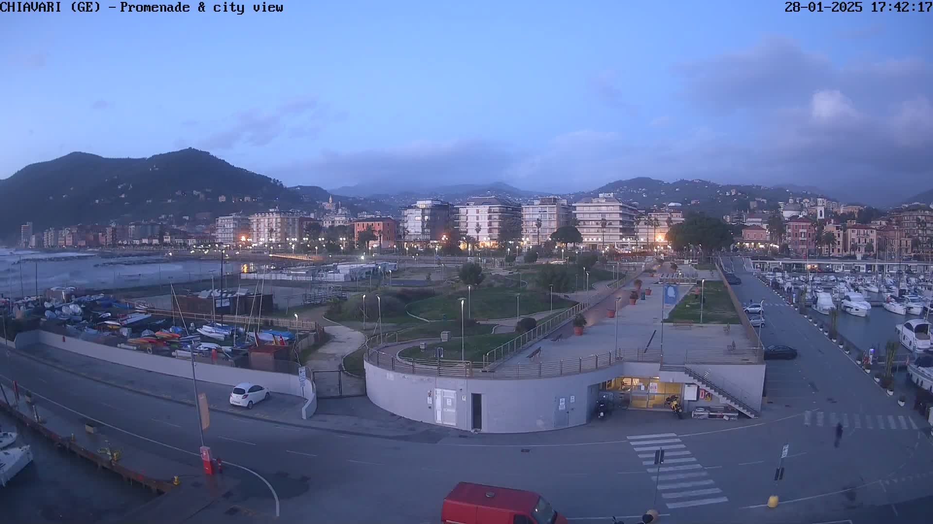 A partly cloudy day reveals a coastal city with a marina filled with boats, a promenade, and a park, all set against a backdrop of hills.