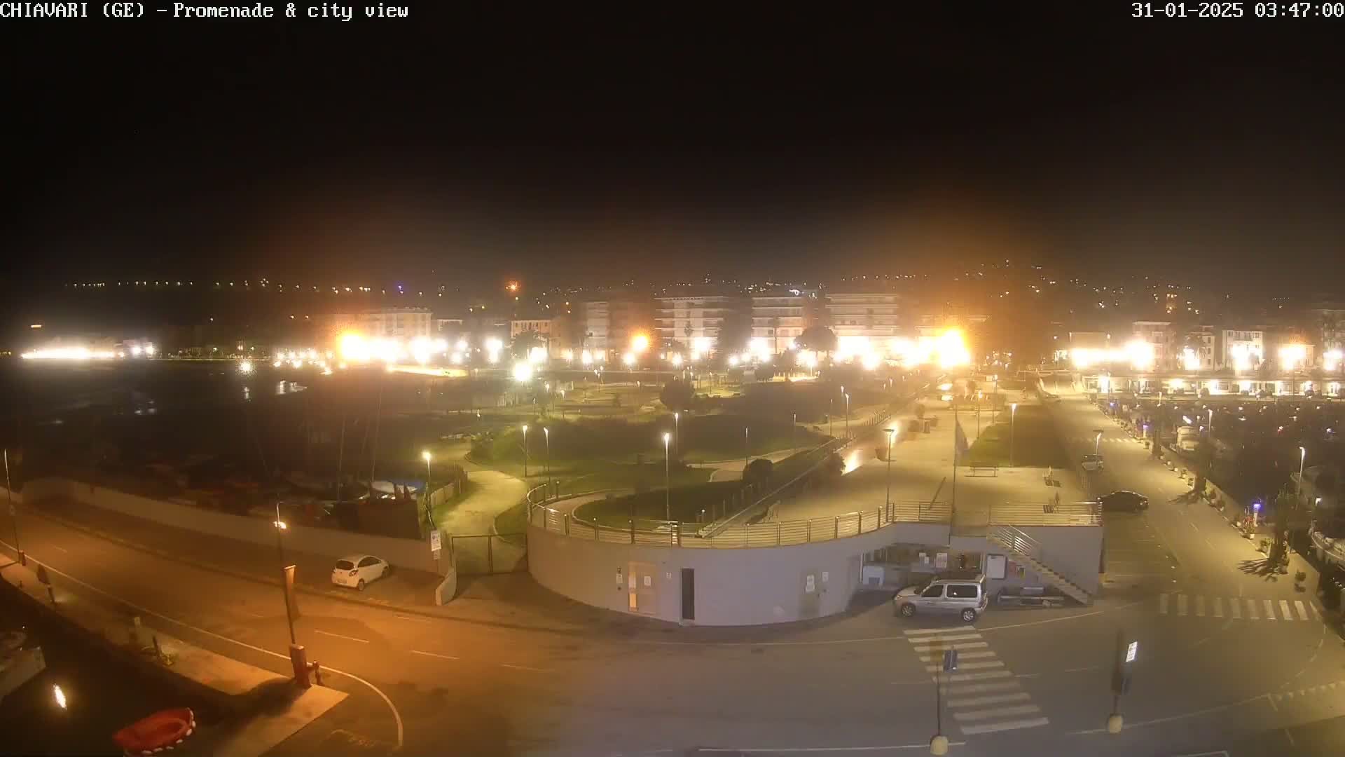 A nighttime aerial view of a city's waterfront promenade and marina, illuminated by streetlights, with a few parked cars visible.