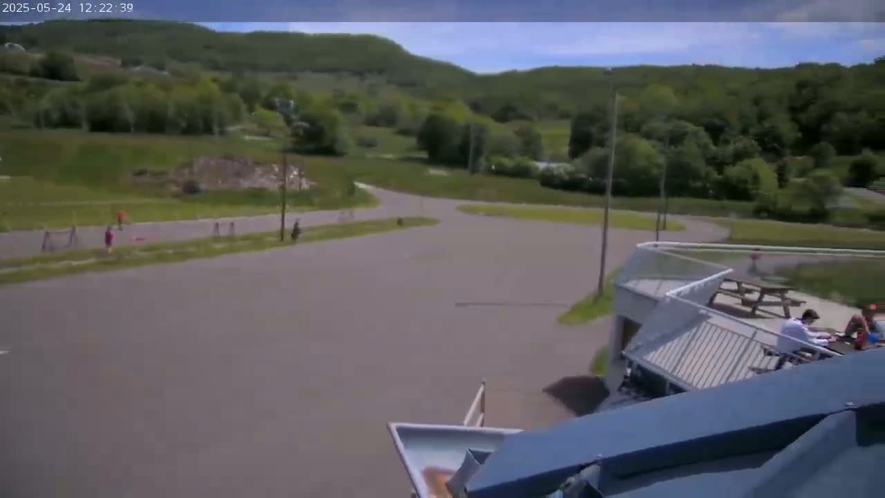 A sunny day reveals a landscape of green hills, trees, and a paved area, possibly a park or parking lot.