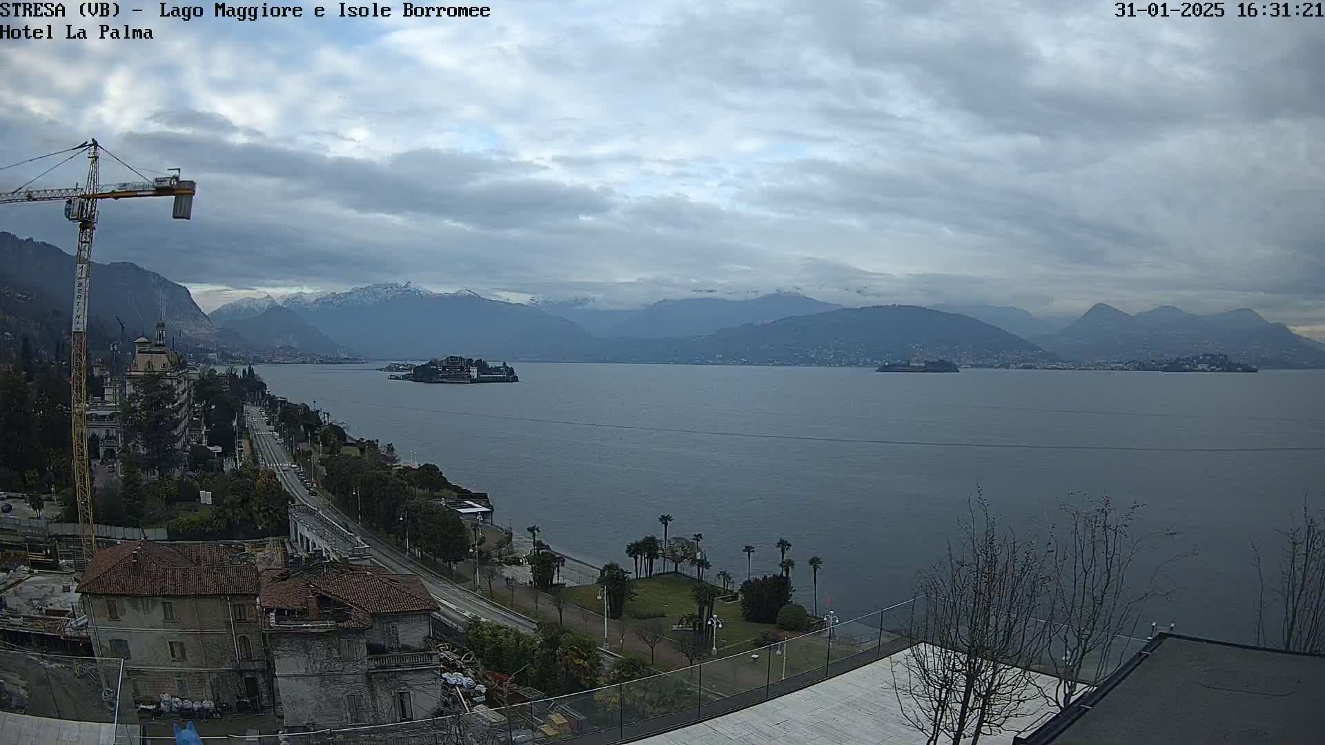 A partly cloudy day reveals a lake view with distant mountains, islands, a shoreline road lined with buildings, and a construction crane.