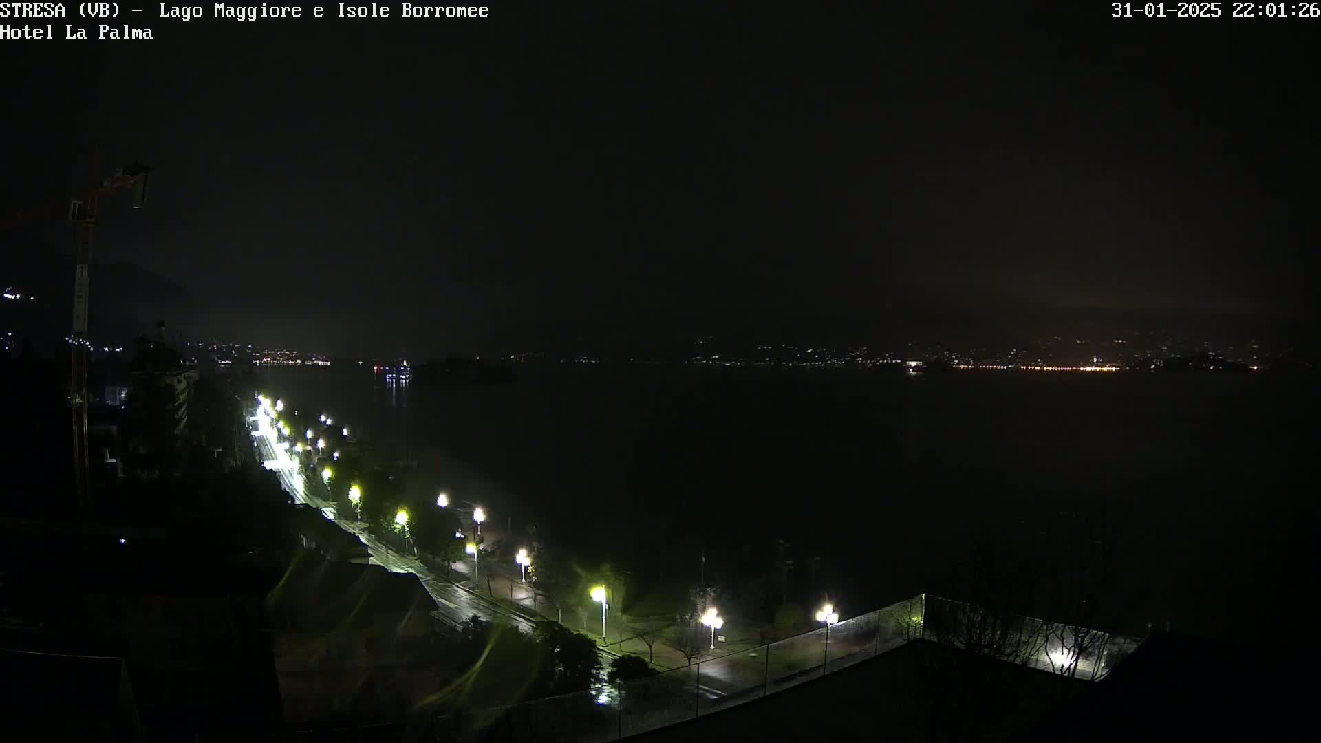 A nighttime view of a lakeside town with a road lined with lights, a body of water reflecting distant city lights, and a construction crane visible in the foreground.