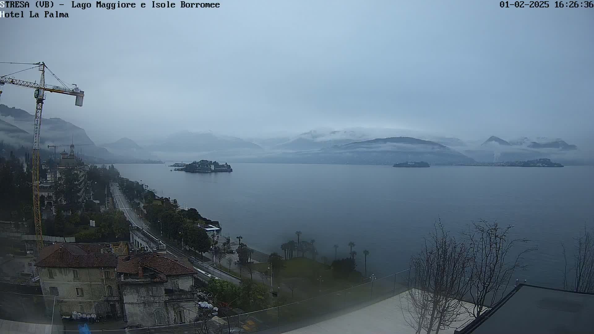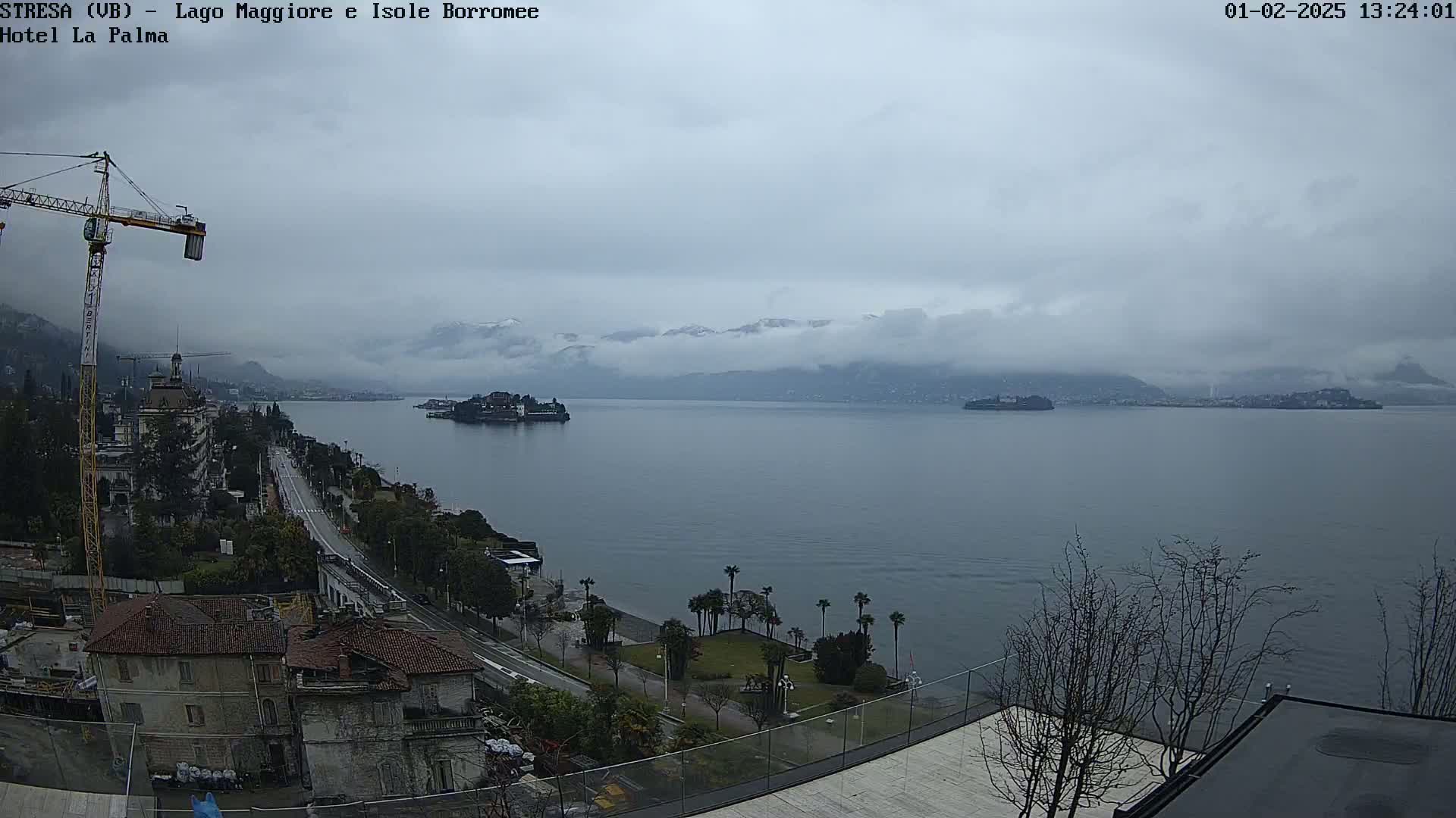 A large body of water stretches toward overcast mountains under a gray sky, with a construction crane and buildings visible in the foreground.