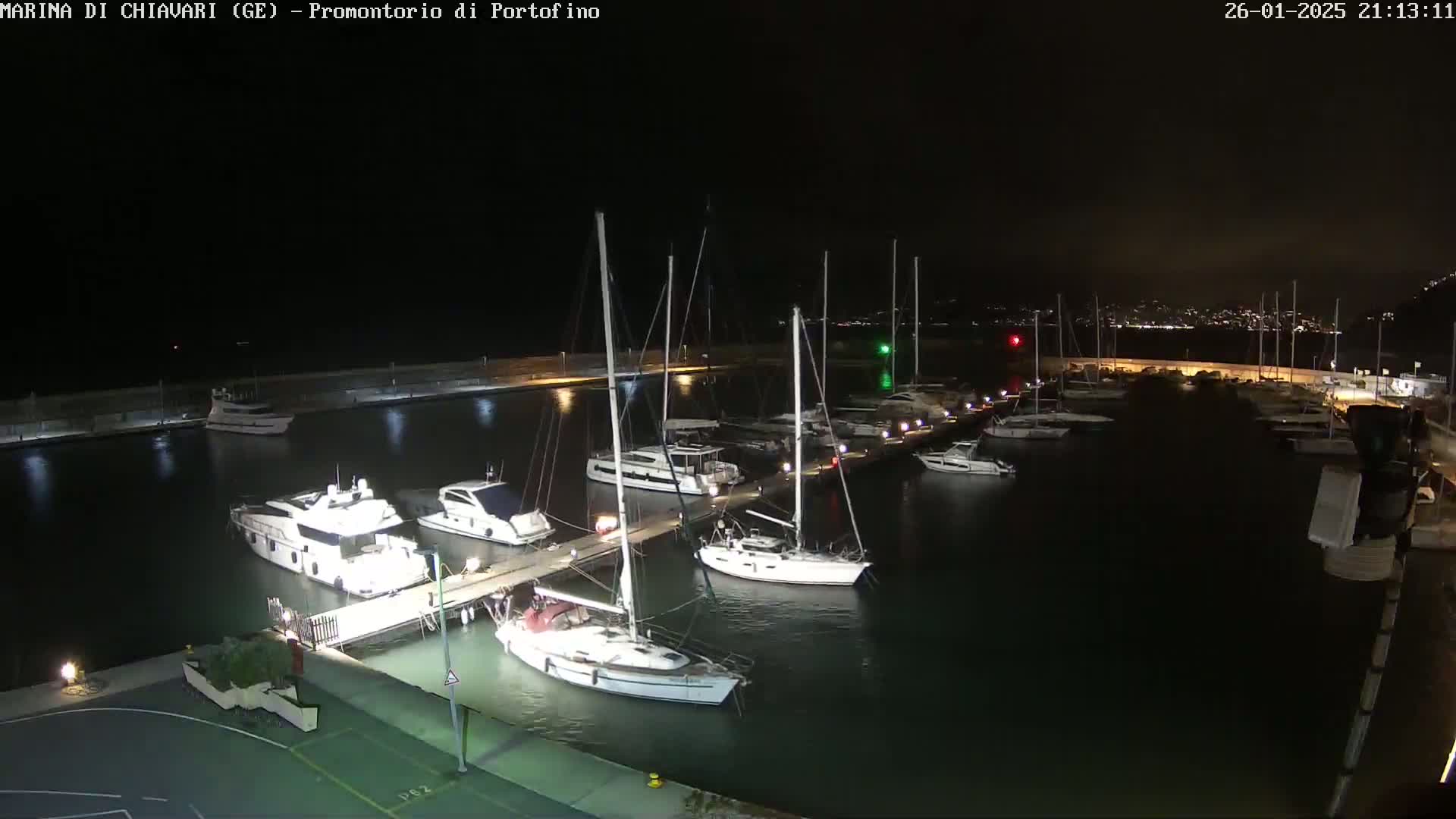 At night, a marina is illuminated, showing numerous boats docked along piers.