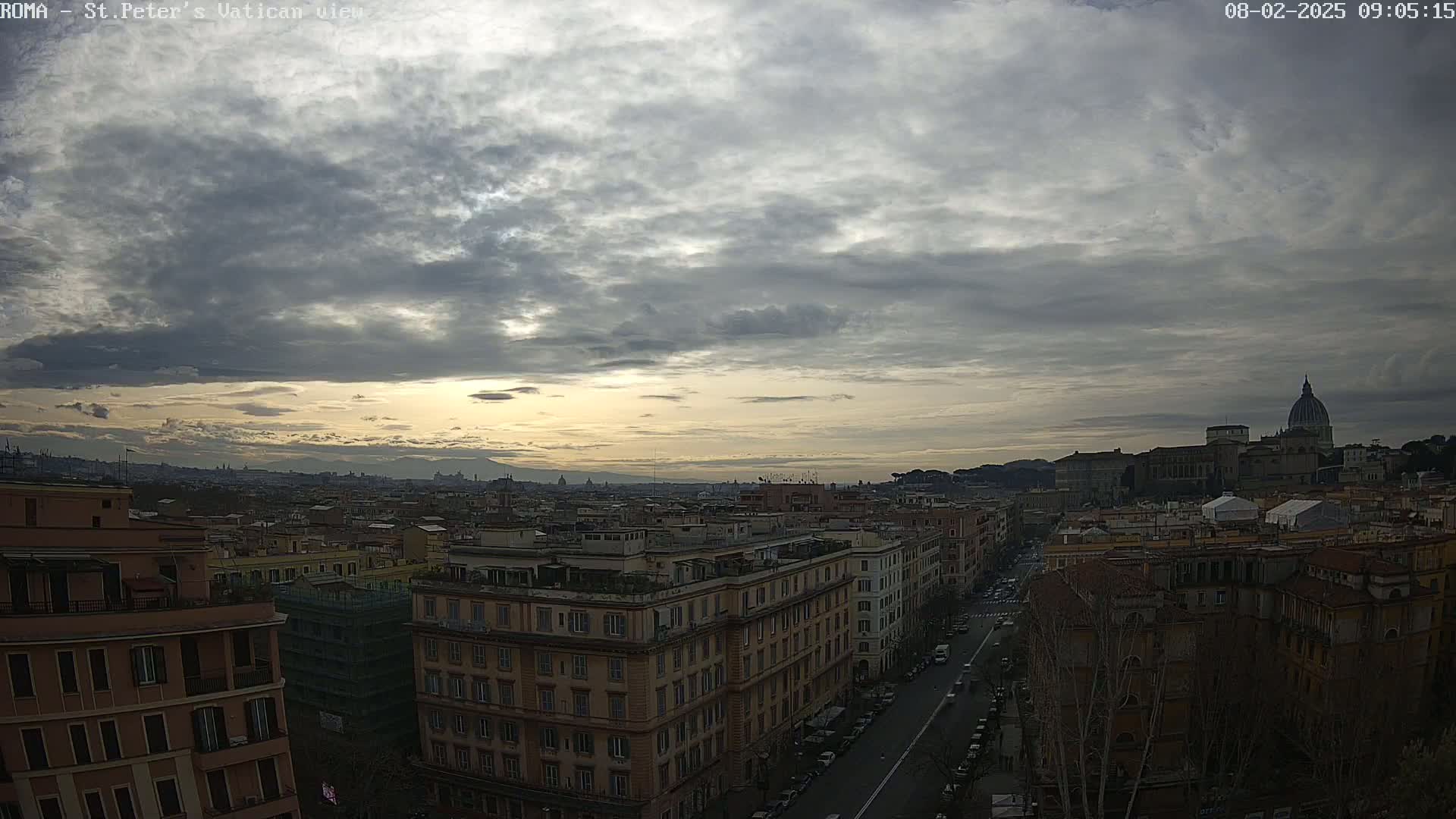 A partly cloudy sky overlooks a cityscape of multi-story buildings, with the dome of St. Peter's Basilica visible in the distance.