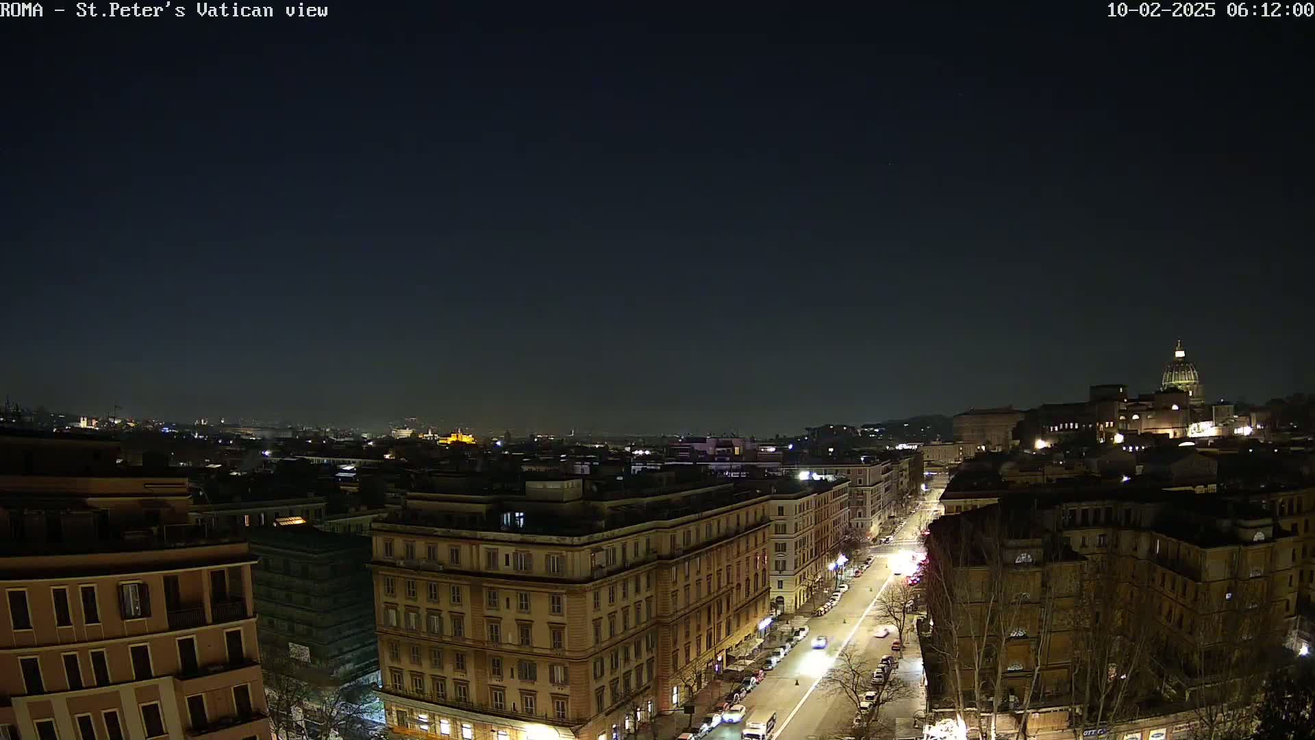 A nighttime view of a city street and buildings, with St. Peter's Basilica visible in the distance under a dark, mostly clear sky.