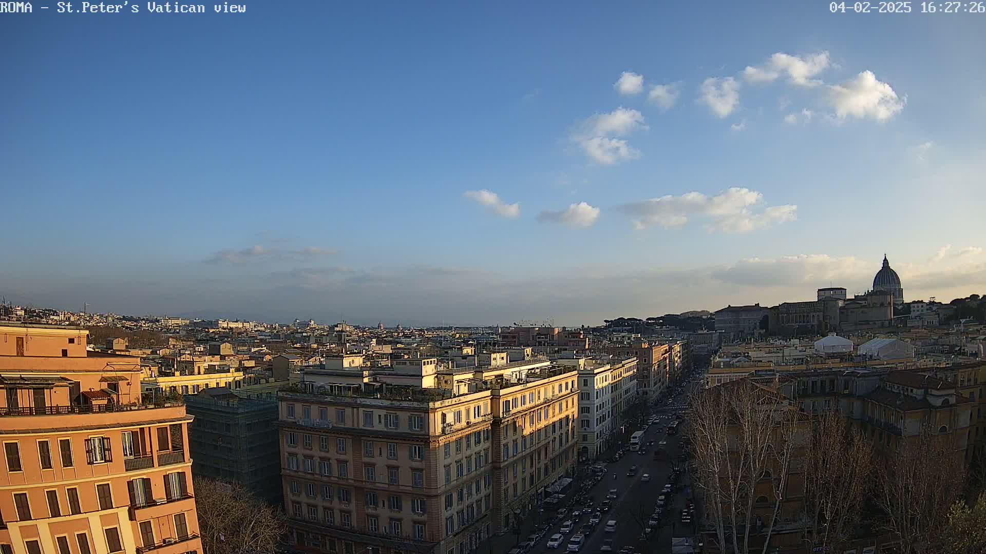A mostly sunny cityscape view shows many buildings, a street with cars, and the dome of St. Peter's Basilica in the distance under a mostly clear blue sky with some clouds.