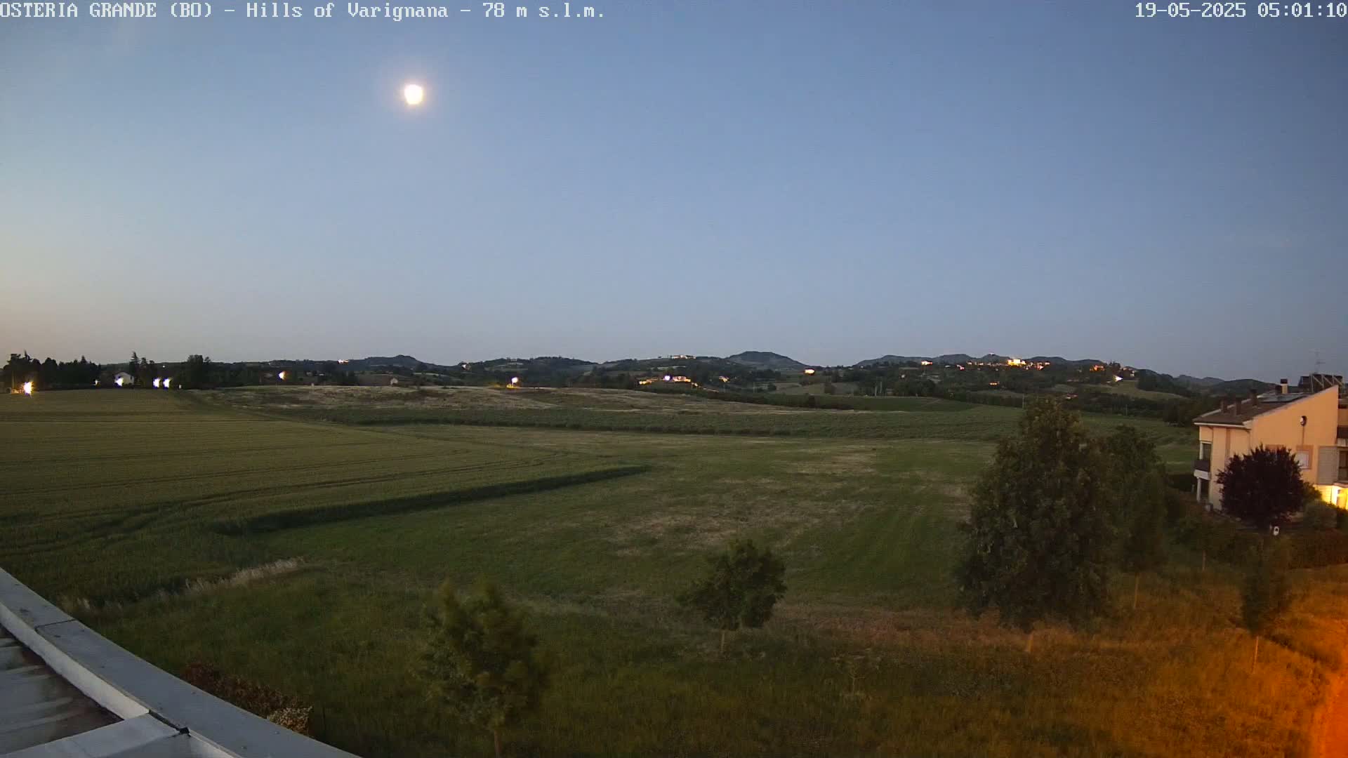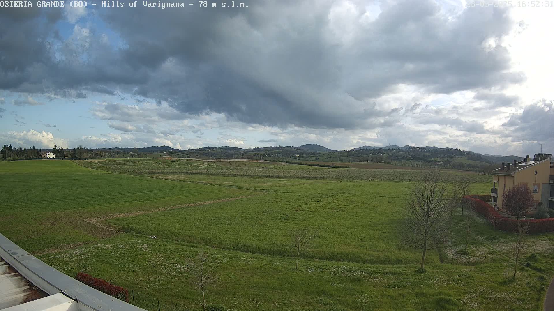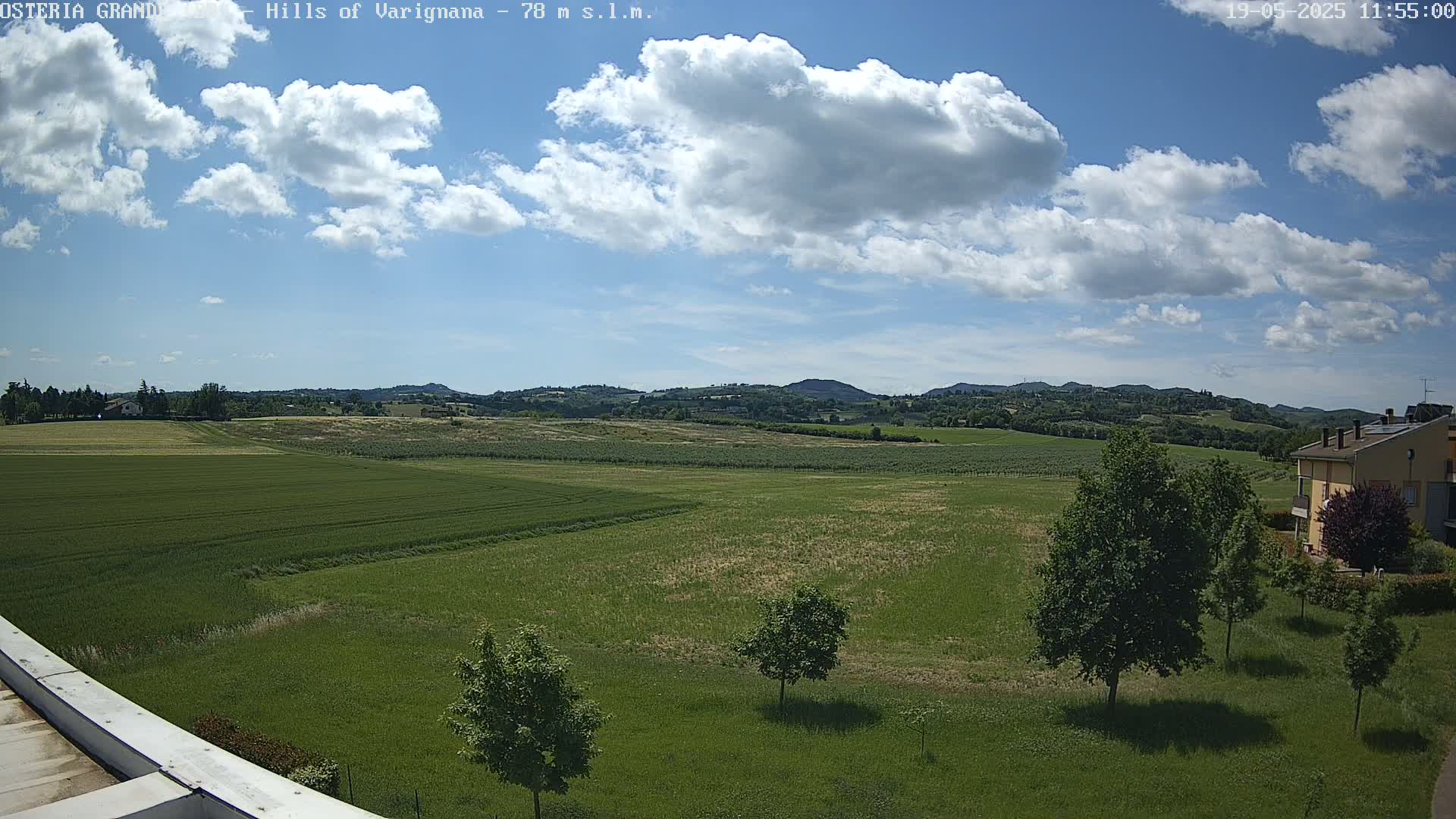 A high-angle view shows a mostly sunny day over rolling hills and farmland, with some trees and a building visible in the foreground.